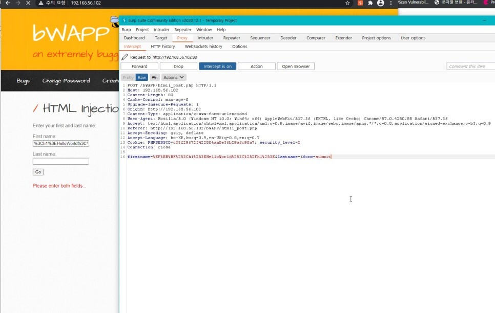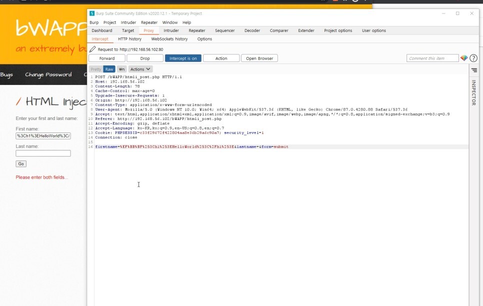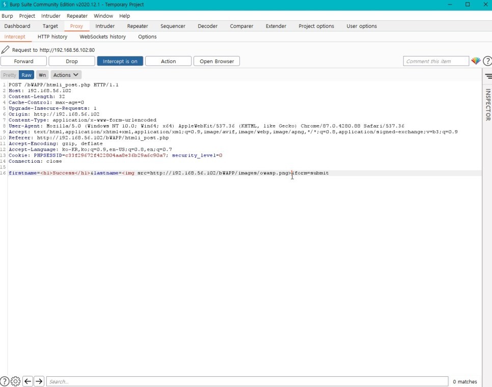 이번에는 %3Ch1%3EHelloWorld%3C%2Fh1%3E 구문을 넣고 인터셉트를 해보았다.