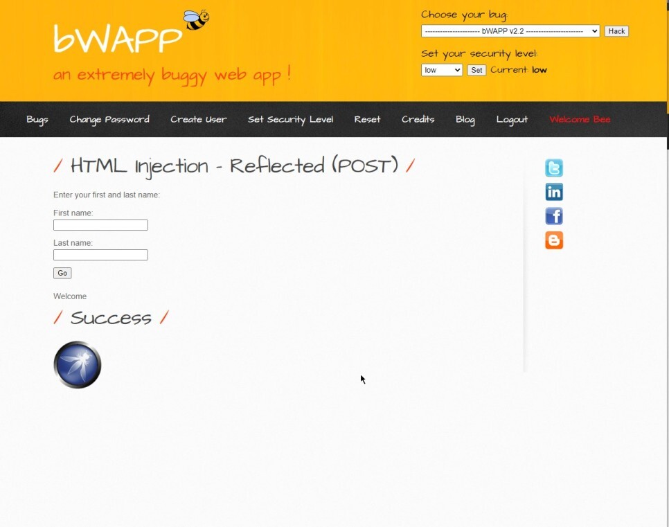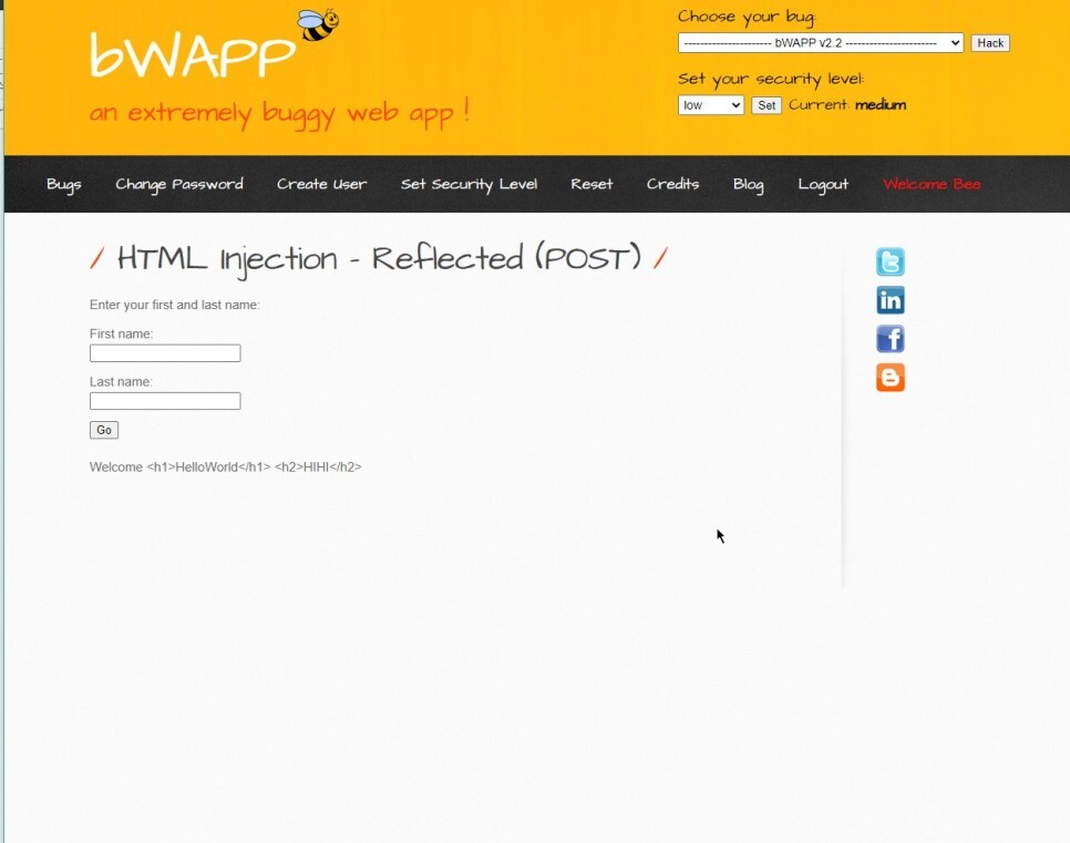프록시 서버를 설정하거나 버프 슈트의 proxy 탭에 open browser를 눌러 버프슈트용 브라우저를 연뒤 bWAPP으로 이동한다.