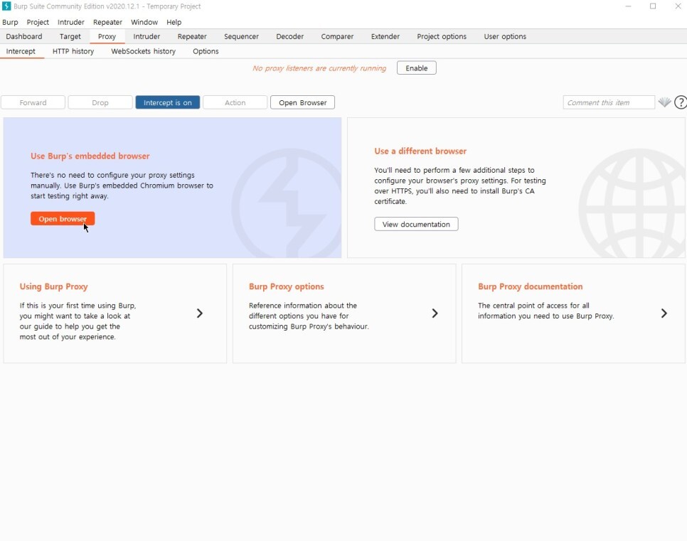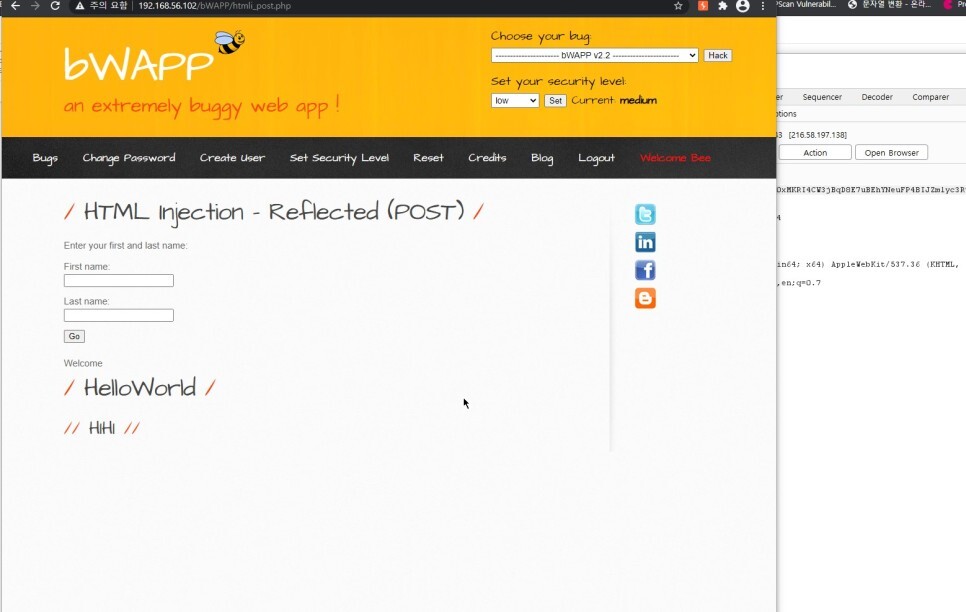 bWAPP으로 이동 시에는 intercept is on 을 off로 바꿔놔야한다. on은 상태를 얻을 때에만 잠깐 틀어둬야한다.