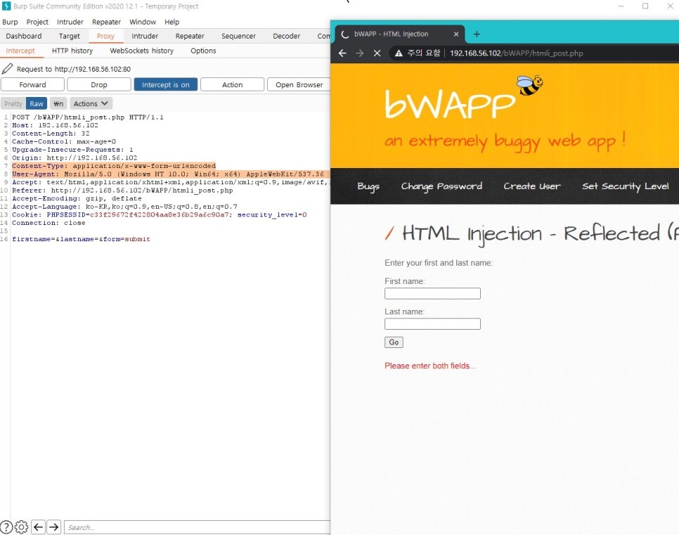 이동 후 post로 가서 인터셉트 on 시킨 뒤 Go 버튼을 눌러보면 Content-type, User-agent 등 HTTP 요청 정보가 나온다.