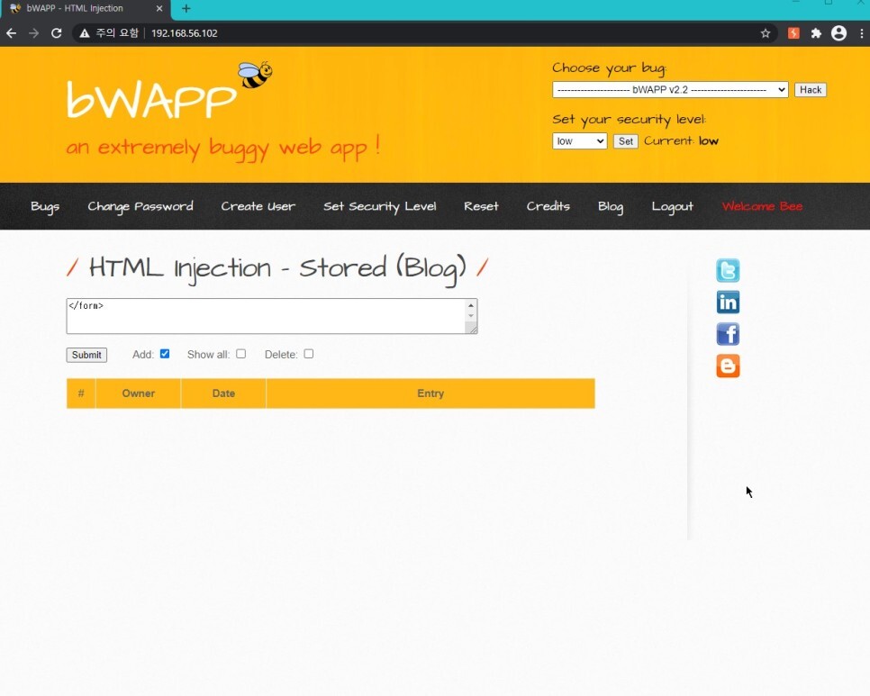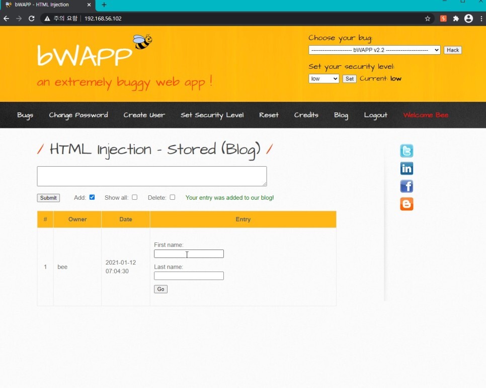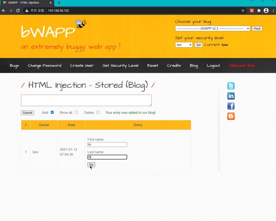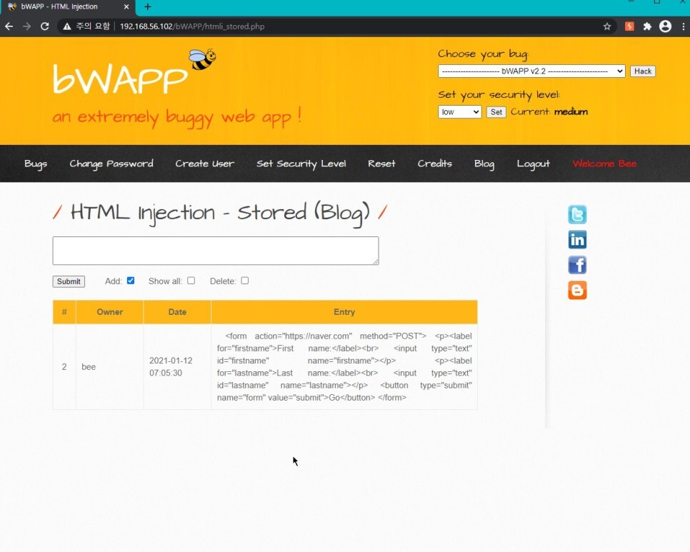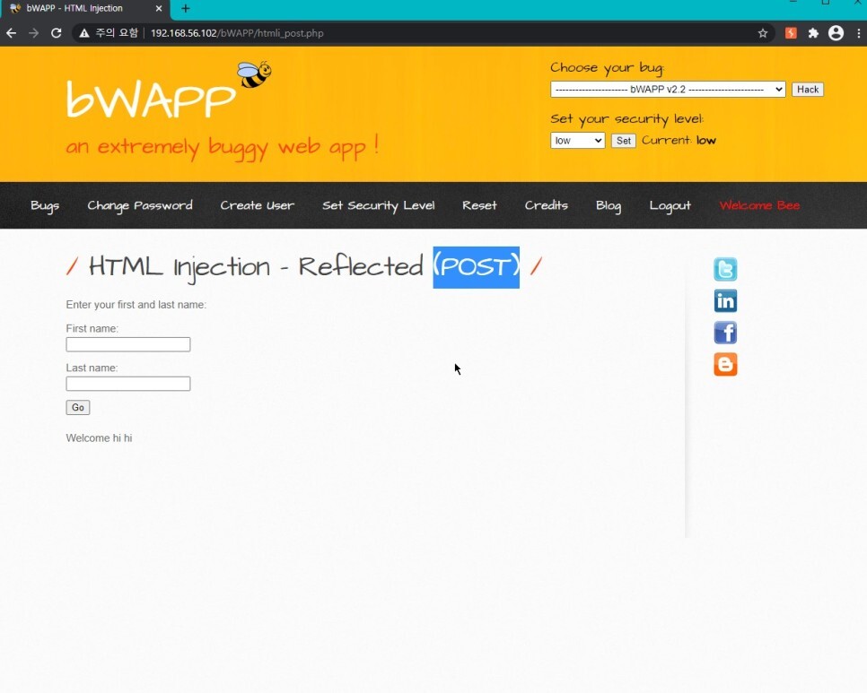 아까 첫 코드를 사용했을 때에는 폼 액션이 action="/bWAPP/htmli_post.php" 이었으므로 post.php로 이동하게 된다.