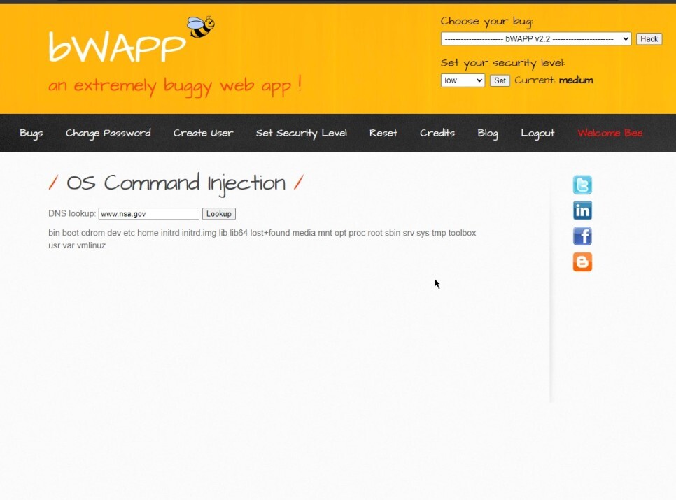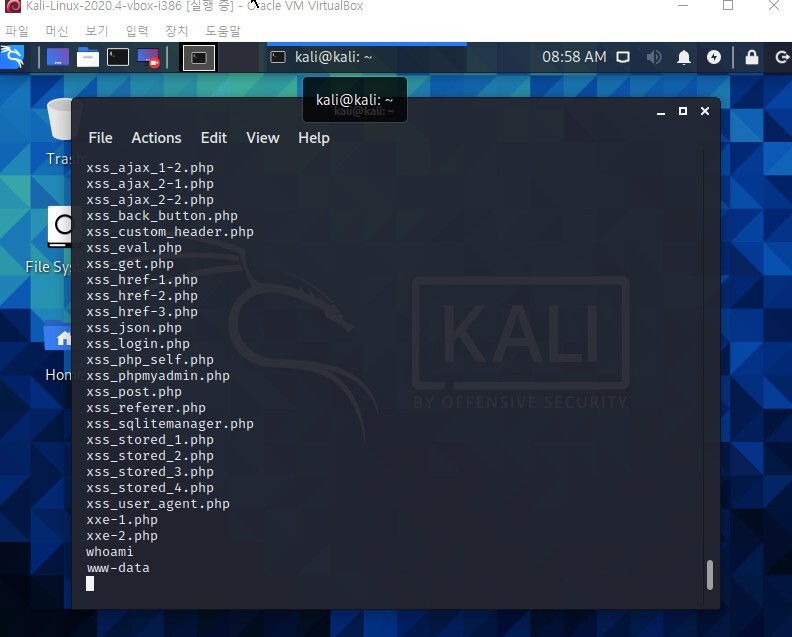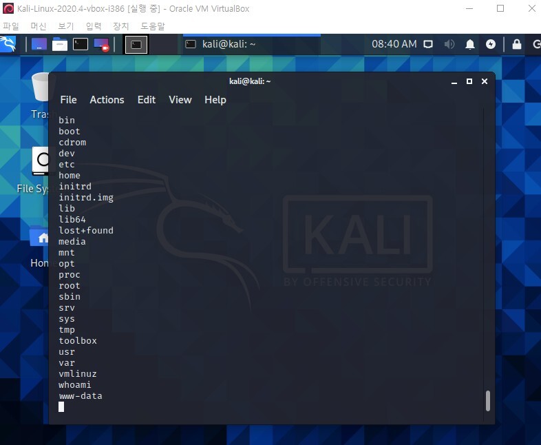 이때 칼리리눅스로 가도 별다른 반응은 없는데 아래 빈칸에다가 명령어를 입력하면 beebox 서버에서 명령을 수행할수 있는 것을 확인할 수 있다.