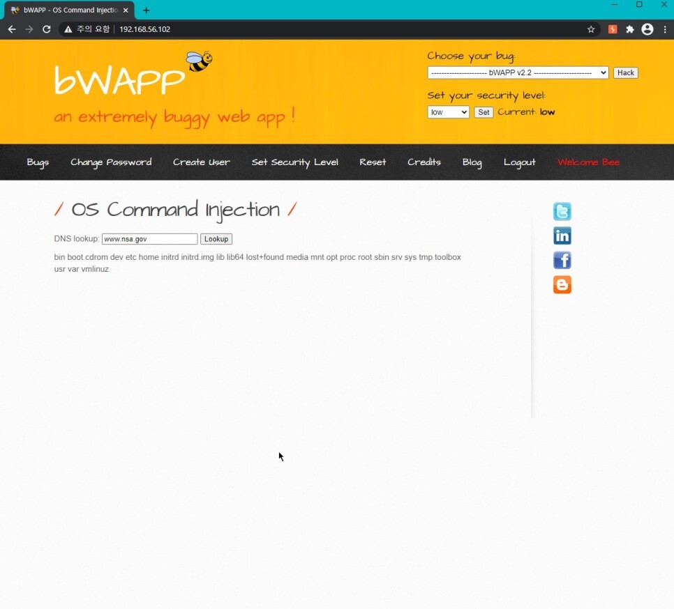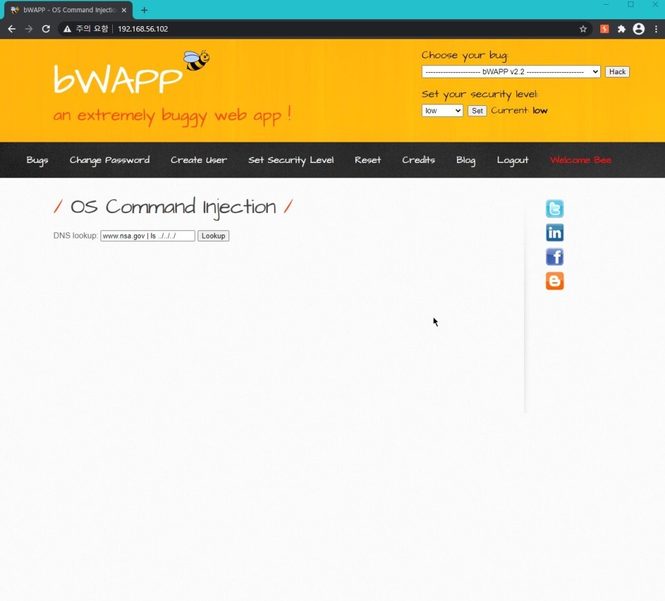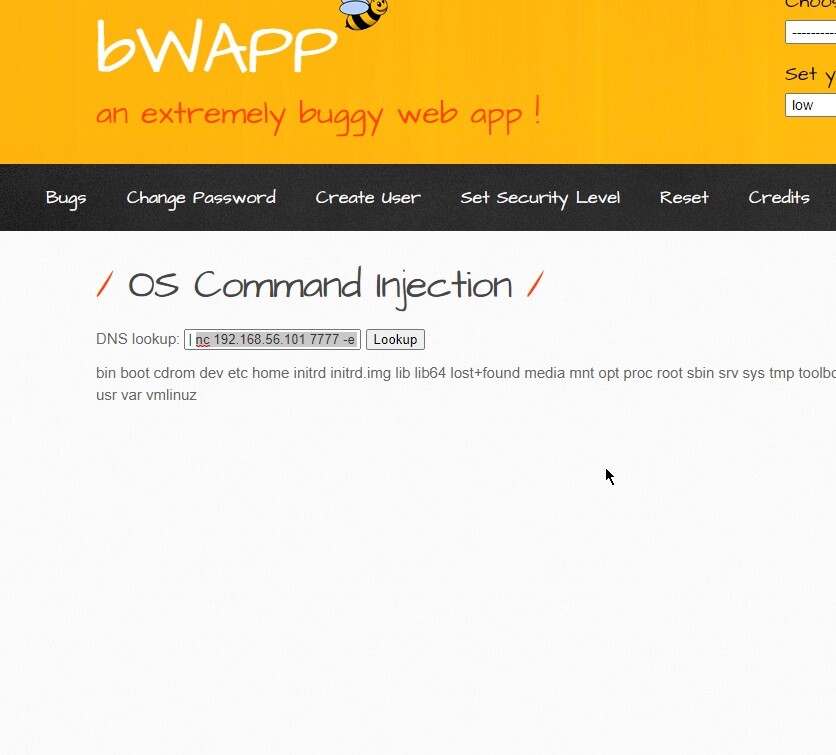 이제 칼리리눅스 아이피주소와 위에 써준 포트번호를 이용하여 bWAPP에서 넷캣과 연결할 것이다.