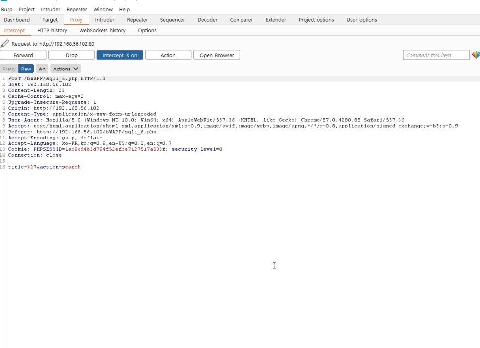 그랬더니 맨 밑에 title과 action 변수가 보이고 title 변수에 ' 의 URL인코딩 값인 %27이 나왔다. 즉, title 변수가 취약한 변수인것을 알 수 있다.