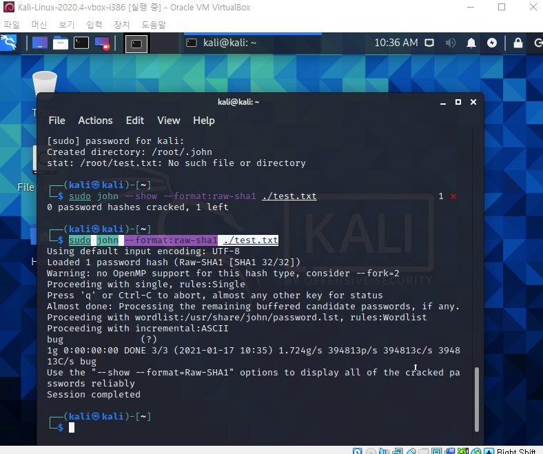>sudo john --format:raw-sha1 ./test.txt(test.txt 파일 경로) 명령어를 입력해서 풀어낸다. 포맷은 sha1로 맞추었다.
