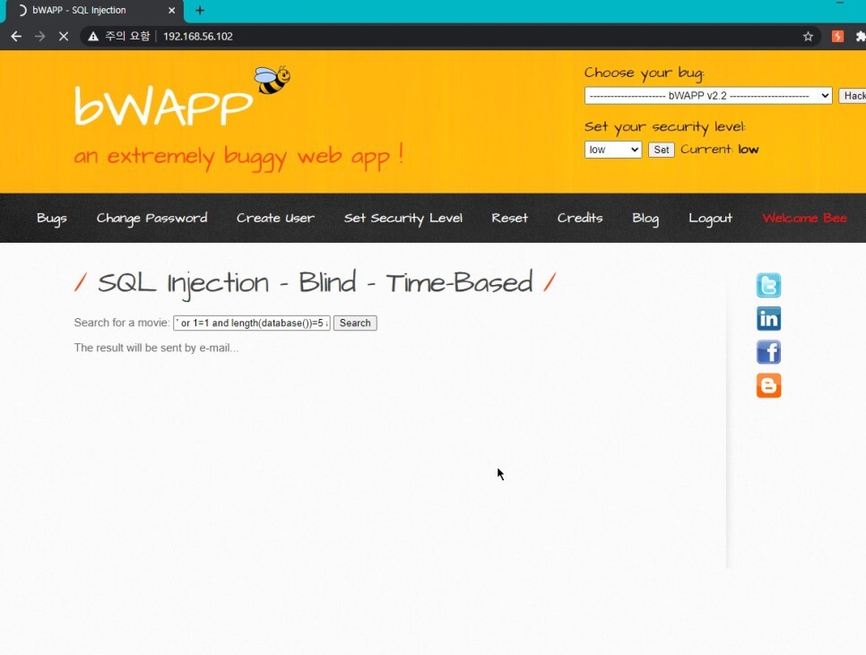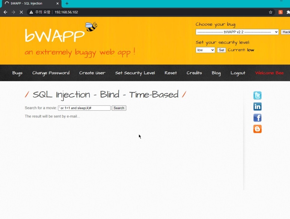 검색 결과가 동일하기 때문에 ' 를 넣어도 오류메시지는 보이지 않는다. 그래서 이번엔 sleep() 함수를 써볼 것이다.