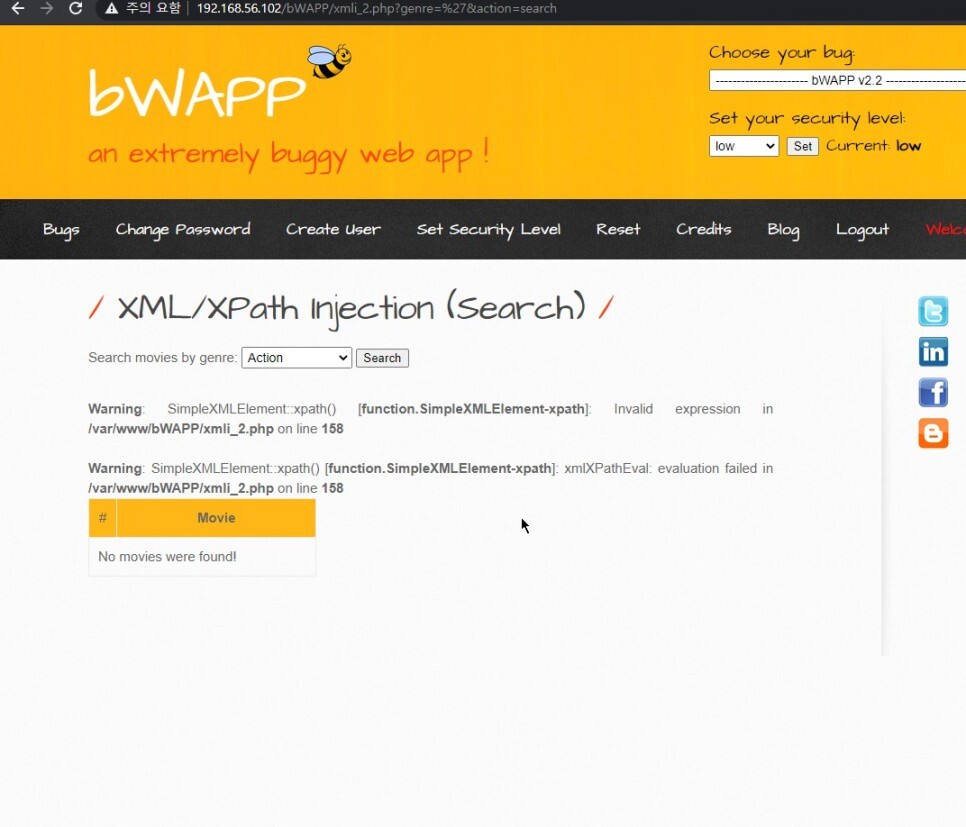 위 URL 주소창에 노출된 genre 변수에 ' 를 넣었더니 XML 에러가 출력되었다. 이제 항상 참인 쿼리를 넣어보자.