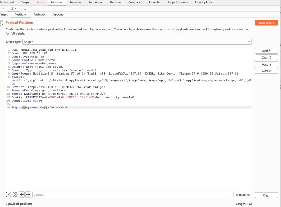 Intruder 탭의 Positions으로 이동해서 아이디와 비밀번호 둘다 모르니 § 변수를 사용해서 login 과 password 에만 넣어준다.