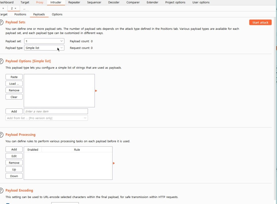 Payload set을 2로 바꾸어 2도 똑같은 작업을 해주어야 한다.