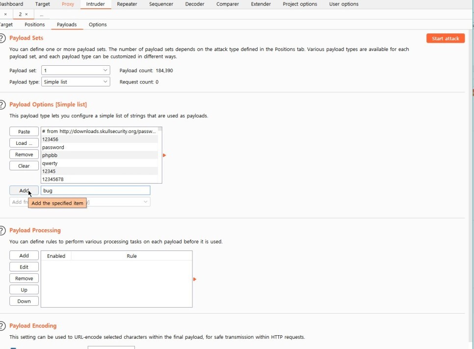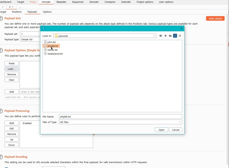 그 뒤 아래 Payload Options에 있는 Load ... 를 누른 뒤 다운 받았던 phpbb.txt 파일을 불러와준다.