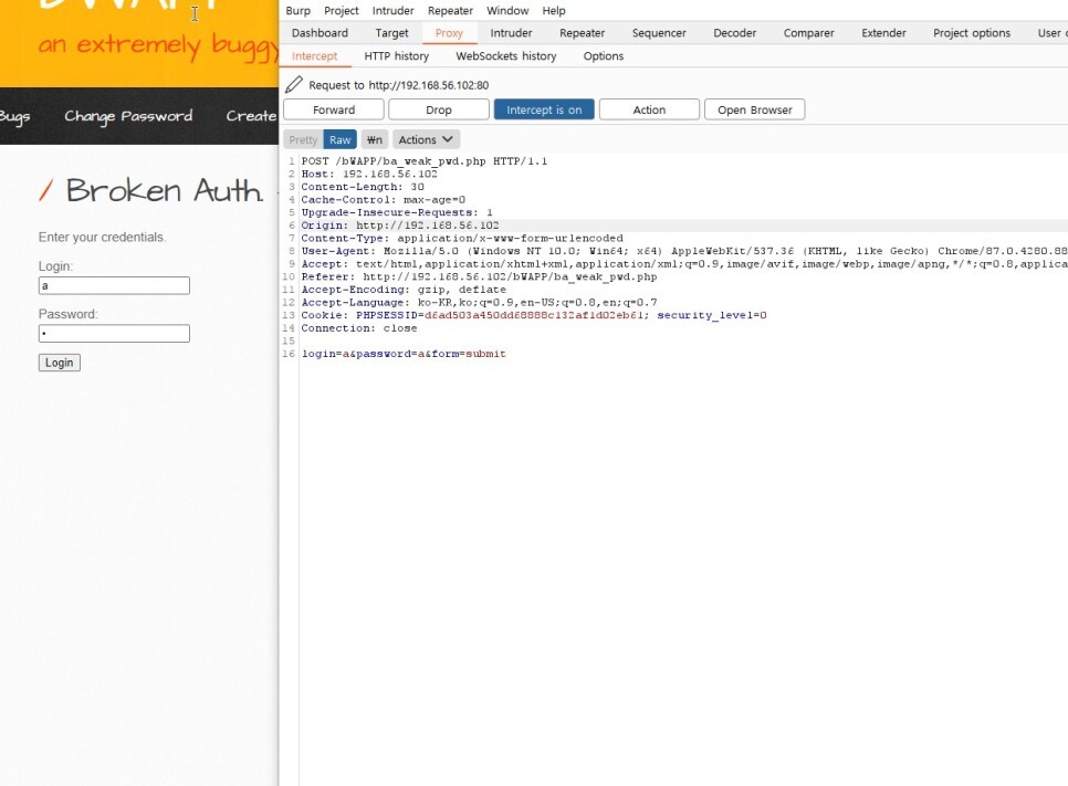 버프슈트가 프로버전이 아니라서 그런지 공격 도중 한정이 되어 멈추게 되기 때문에 버프슈트 말고 칼리리눅스로 사전 공격을 하는것이 나을것같다. 칼리 리눅스로 공격했을 때에 아이디 test 비밀번호 test 가 나왔다.