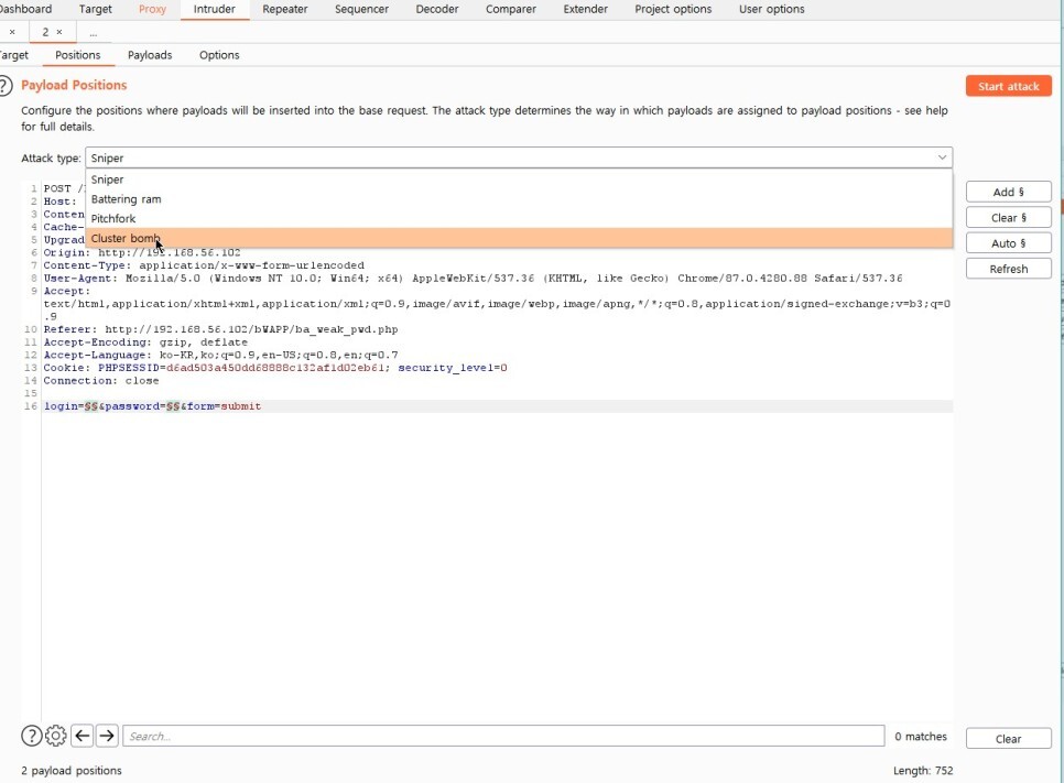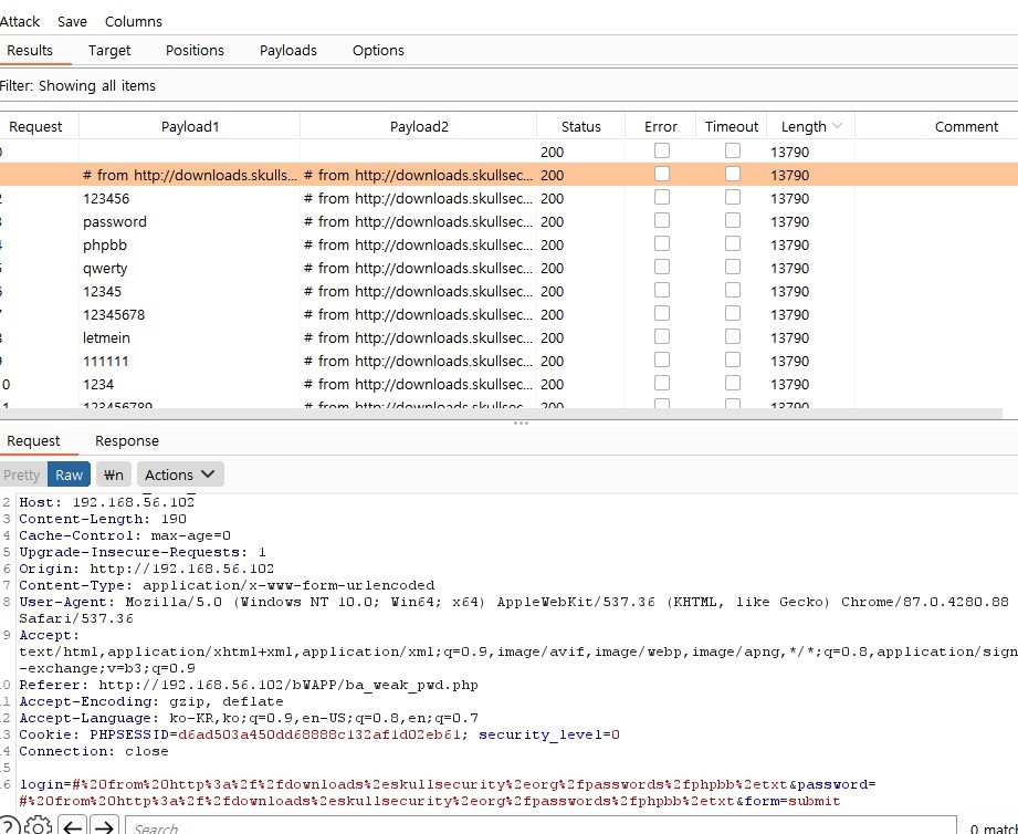 위의 Payload set에서 1은 login 변수를 공격하는 페이로드 지정이고 2는 password 변수를 공격한다.