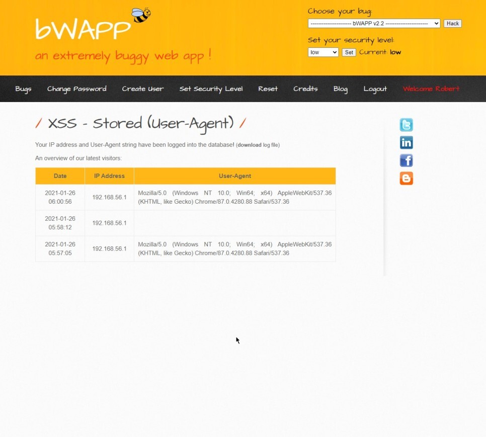 User-Agent를 페이지로 출력하기 때문에 버프슈트를 통해 User-Agent 값에 스크립트 코드를 삽입해 주면 작동할 것 같다.