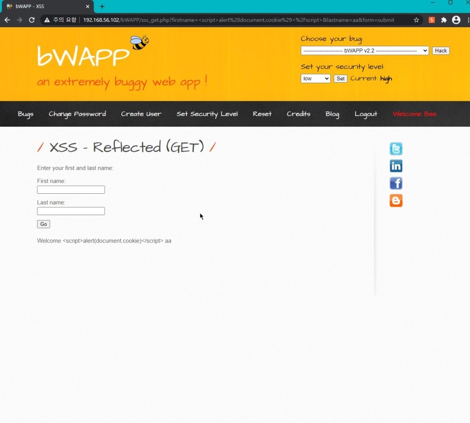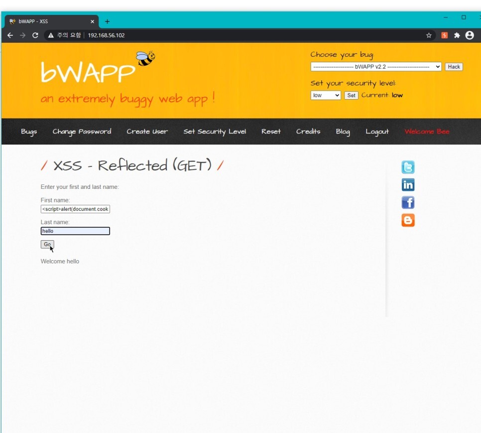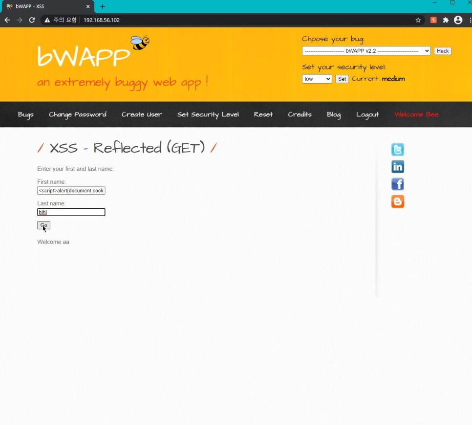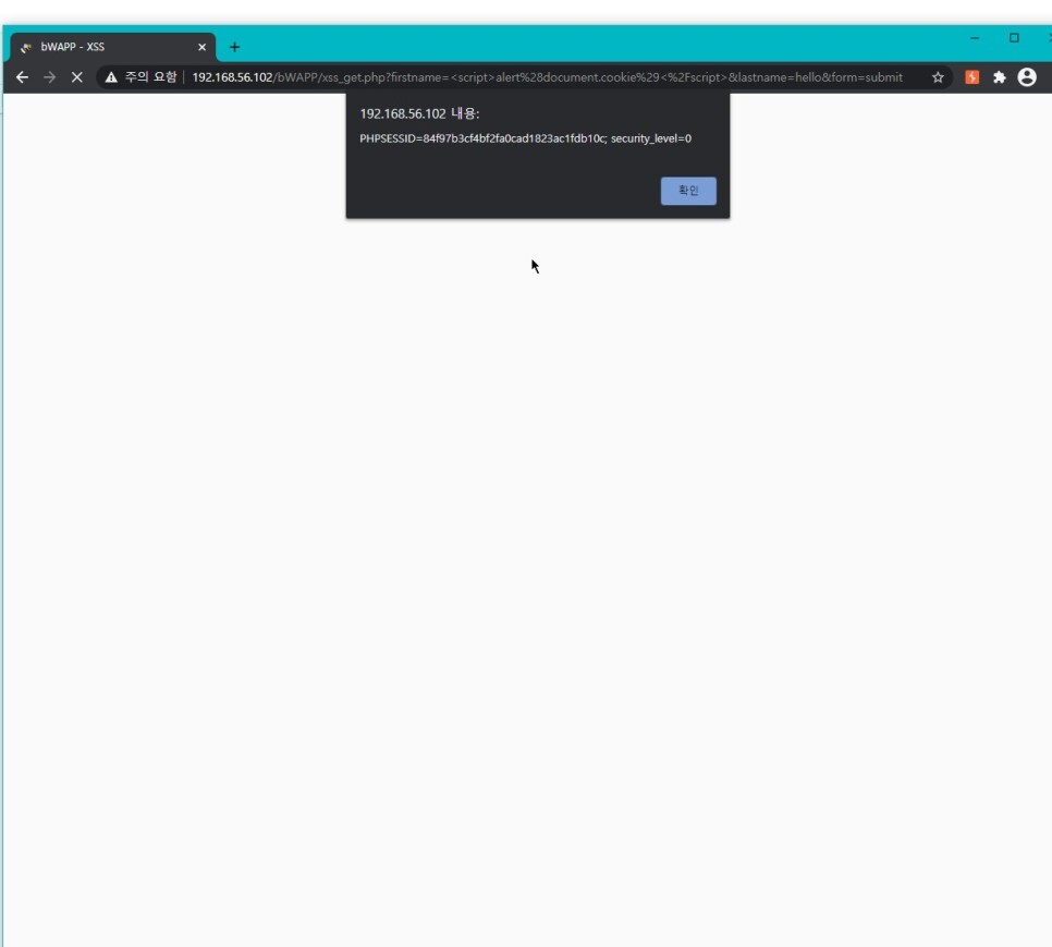 난이도 중으로 변경한 뒤 똑같은 구문을 넣어보았다. <script>alert(document.cookie)</script>