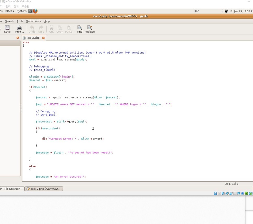 난이도 상에서는 login 변수를 보다시피 세션에서 받아 입력한다. 즉, 이렇게 되면 버프슈트에서 수정해도 로그인한 사용자의 비밀번호 힌트만이 초기화된다. 또한, mysqli_real_escape_string 함수를 통해 힌트값을 필터링하고 있다. SQL인젝션에 사용하는 특수문자는 XXE 공격에도 사용되기 때문에 XML 코드를 일반 문자로 변환시킨다. 그렇기에 만약 힌트값에 SQL 인젝션이나 XXE와 같은 구문을 넣어도 난이도 중부터는 막힐 것이다.