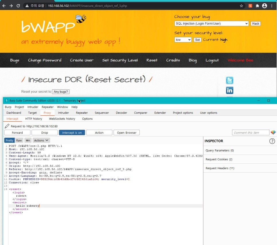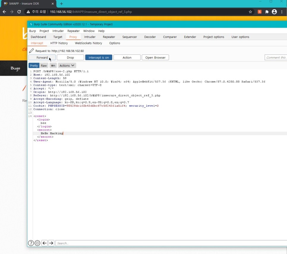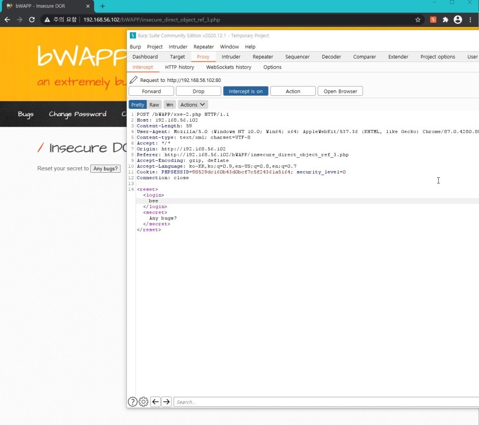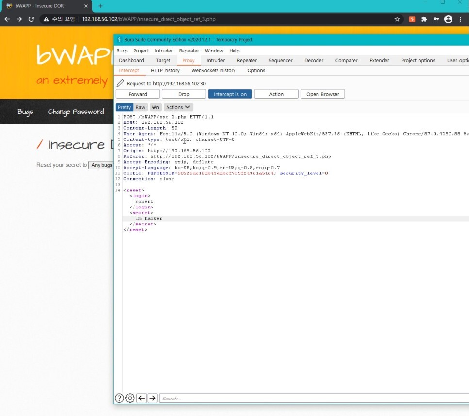 Any bugs? 버튼을 누르고 해당 요청을 버프슈트로 캡쳐해 보았다. 보아하니 xxe-2.php 페이지로 XML 타입의 변수를 전달하는듯 하다. 전송되는 변수는 login과 secret이고, 아이디와 초기화할 비밀번호 힌트가 입력되어 있다.