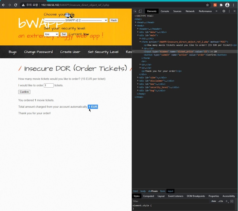 이처럼 가격과 같이 변하면 안되는 데이터의 경우 웹페이지 개발자 도구나 소스코드에서 사용자에게 변수가 드러나지 않도록 해야한다.