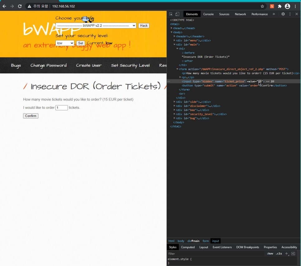 난이도 중과 상에서는 티켓 가격을 수정할 수 있던 hidden 속성의 변수가 개발자 도구에 노출되지 않는다.