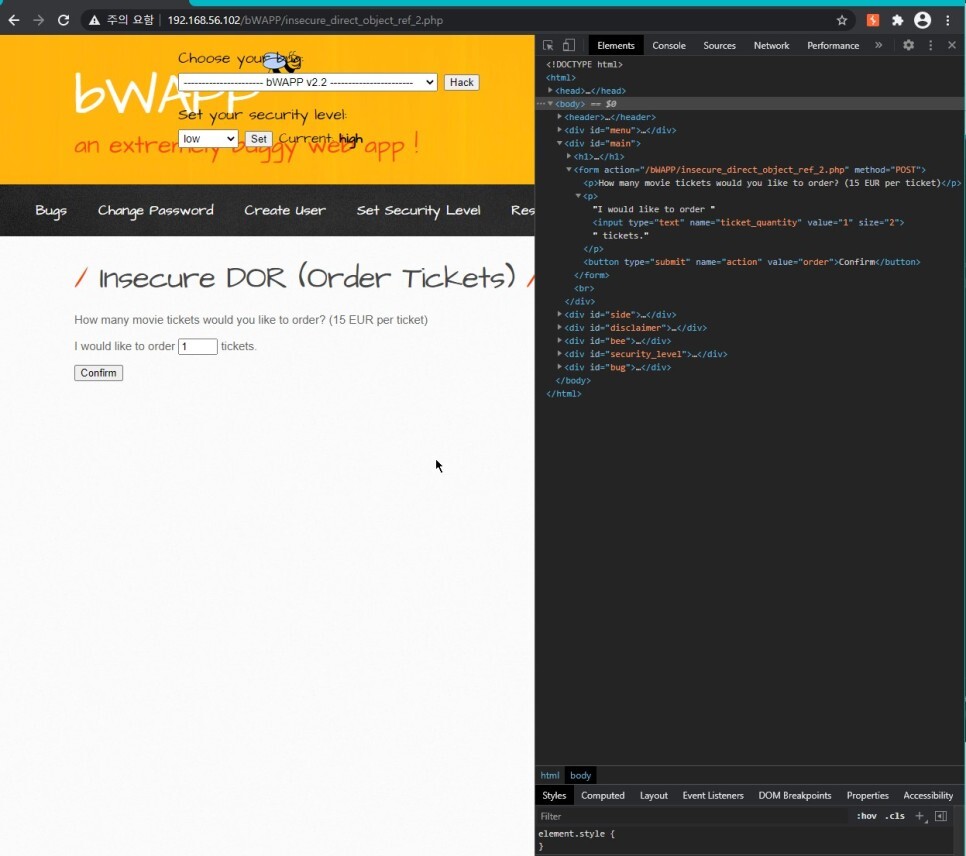 이번 페이지는 티켓 주문 기능이 있다. 티켓의 가격을 조작해보자.
