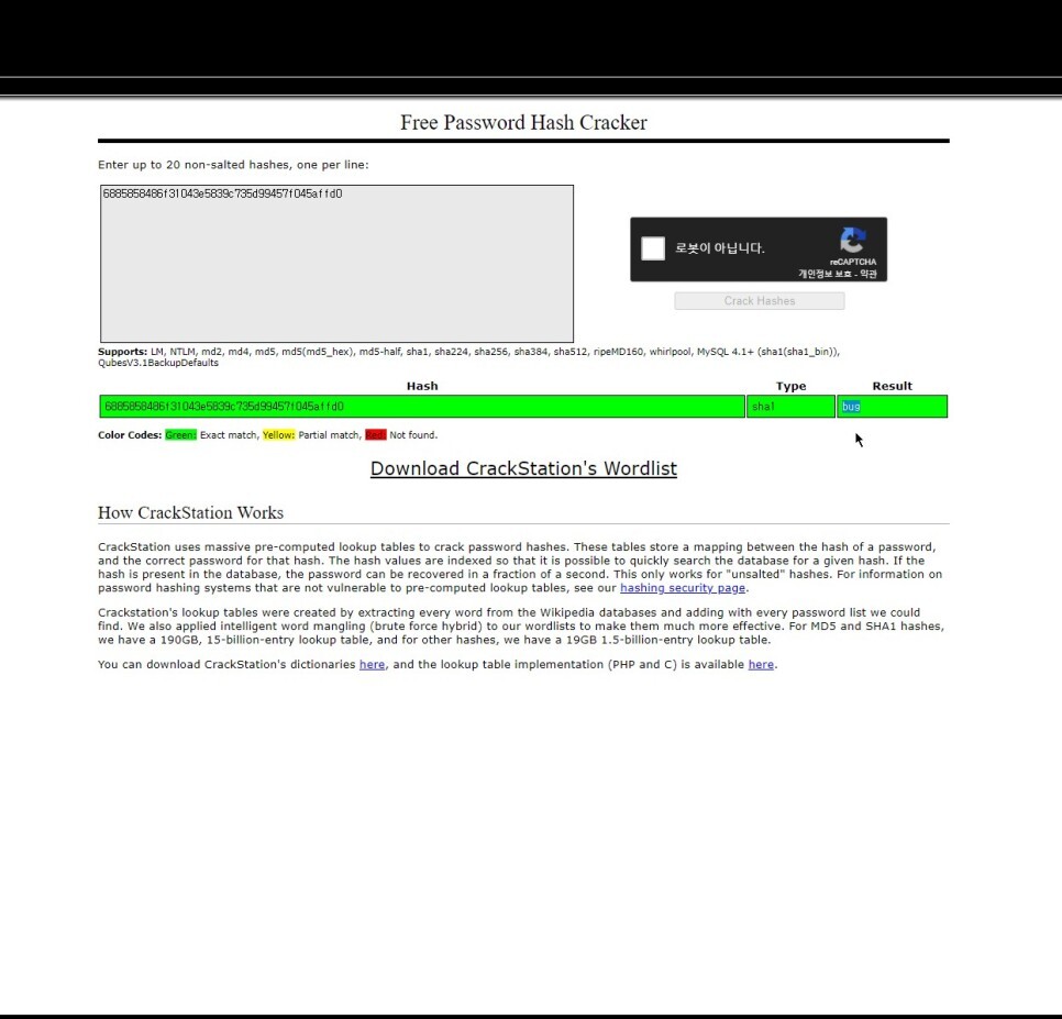 CrackStation 홈페이지에 해시값을 넣어본 결과 원문 값이 노출된 것을 볼 수 있다. 이처럼 이미 깨진 해시 함수를 사용하면 값이 노출될수 있다.