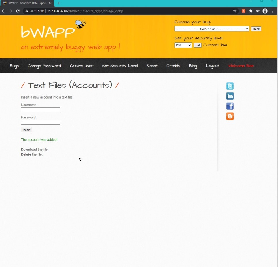 계정정보를 입력하고 Insert를 누르면 파일을 다운로드하거나 삭제하는 링크가 생긴다.