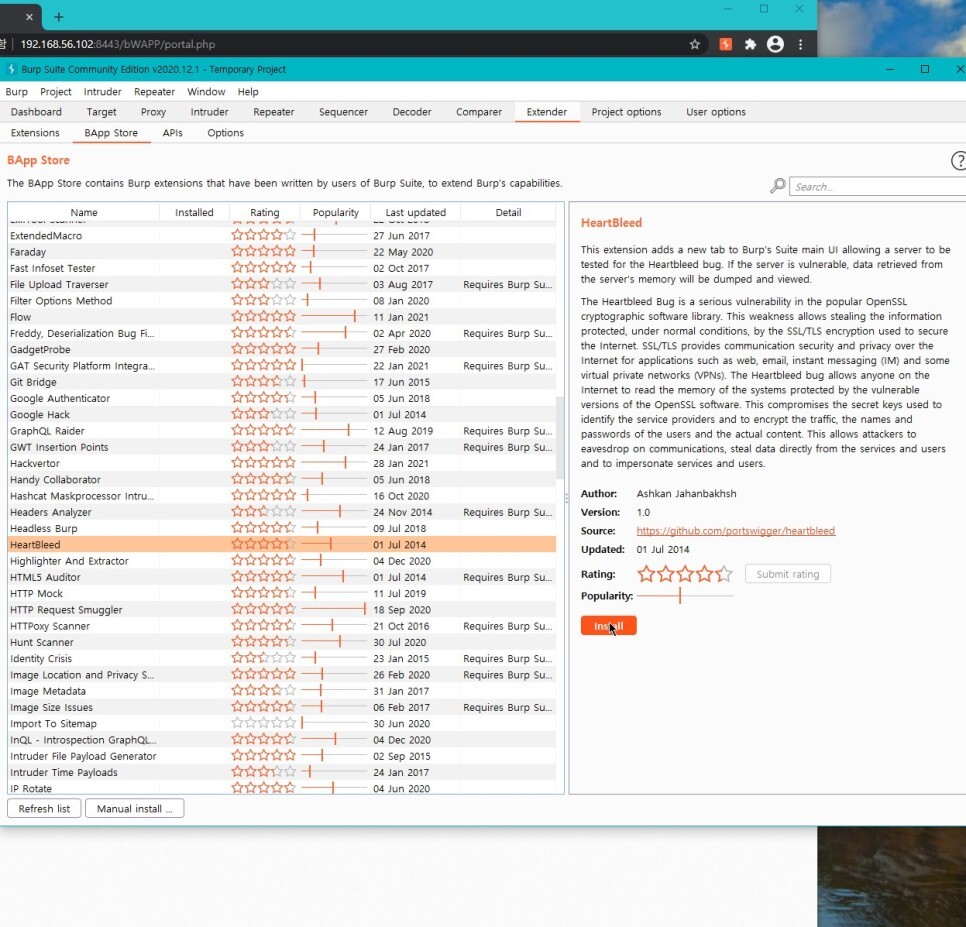 Extender 탭의 BApp Store에서 HeartBleed를 Install 해준다.