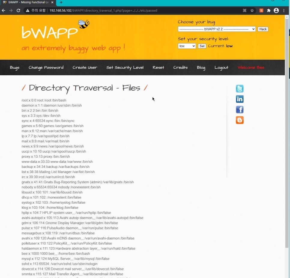 이번 페이지도 디렉터리를 이동한 것처럼 GET 방식으로 인해 변수가 노출된다. 변수 값이 파일에 대한 값을 받을 때에 파일 디렉터리 리스팅이 가능한듯 하다. 이제 etc 폴더의 passwd 파일을 살펴보자