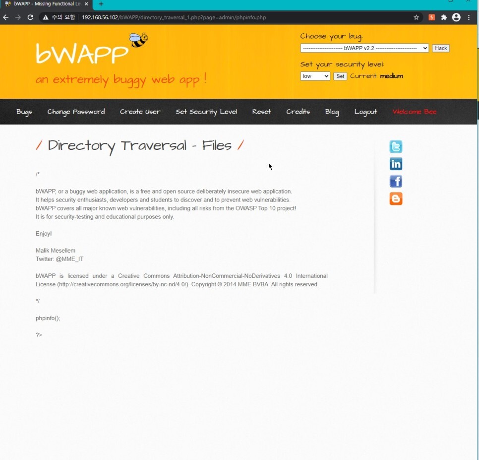 admin/phpinfo.php 경로를 넣어주어 phpinfo 파일의 내용이 페이지에 출력된 것을 볼 수 있다. 이처럼 파일이 저장된 디렉터리와 파일명을 정확이 알고 있으면 쉽게 파일의 내용을 출력할 수 있다.