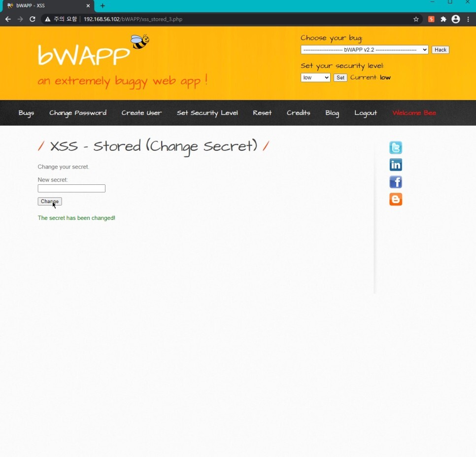 알림창의 확인을 눌러주면 스크립트 코드를 만들었던 페이지에서 계정을 넣어주면 이렇게 이 페이지에 표시가 되어 볼 수 있게 된다. 이번엔 XSS stored change secret 페이지에서도 공격을 시도해 보자.