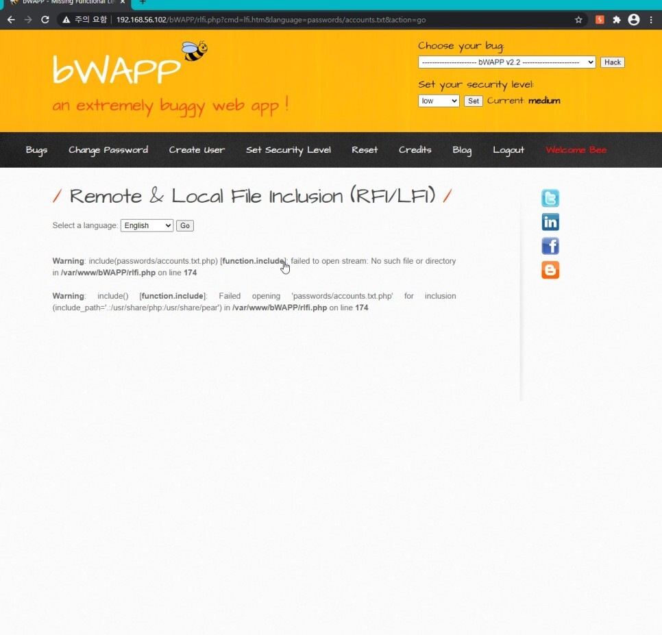 난이도 중은 변수값을 살펴보면 lang_en.php 가 아닌 lang_en 인것을 보고 추측해 보았을때 위 필터링은 language에 입력한 변수에 .php를 뒤에 강제로 붙여버리는 필터링을 수행하는 듯 싶었다. 그렇다면 위에서 수행한 공격은 막히겠지만 웹셸같은 경우는 업로드시킬 수 있을것 같다.