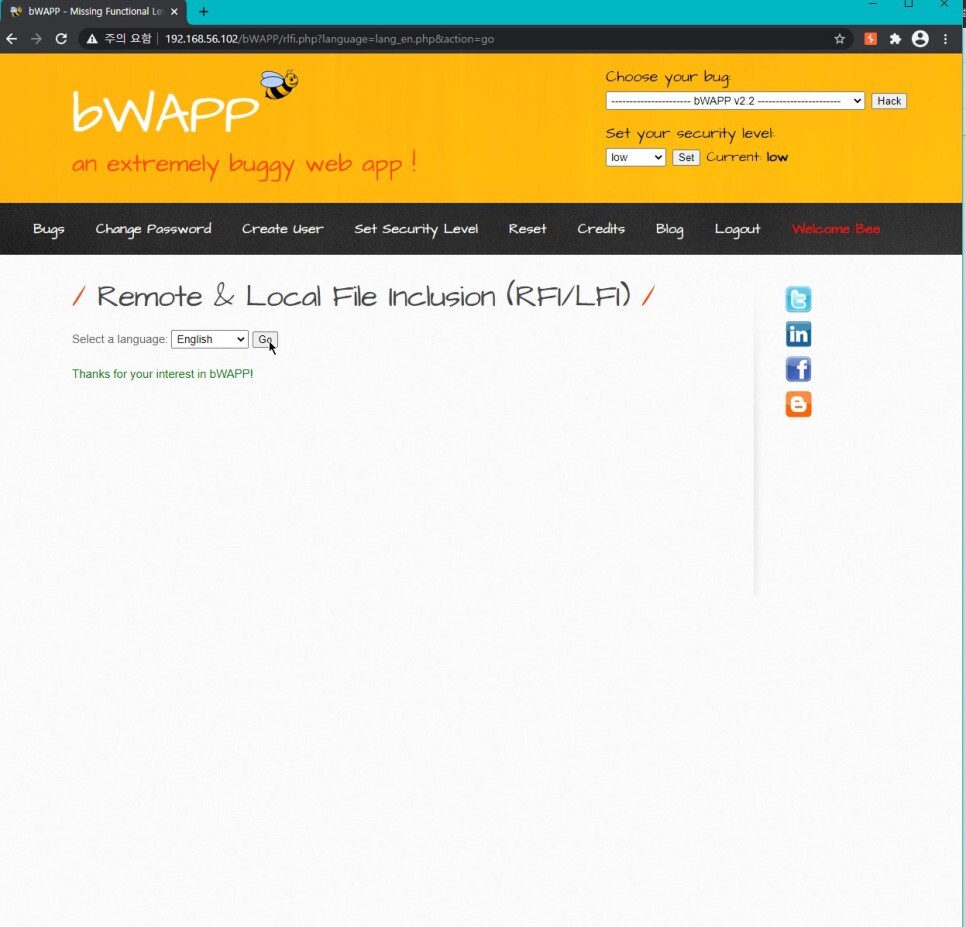 이번 페이지에서 Go를 눌러주면 GET 방식으로 인해 URL에 변수가 노출된다. 취약한 language 변수에 LFI 공격을 시도해 볼 것이다.