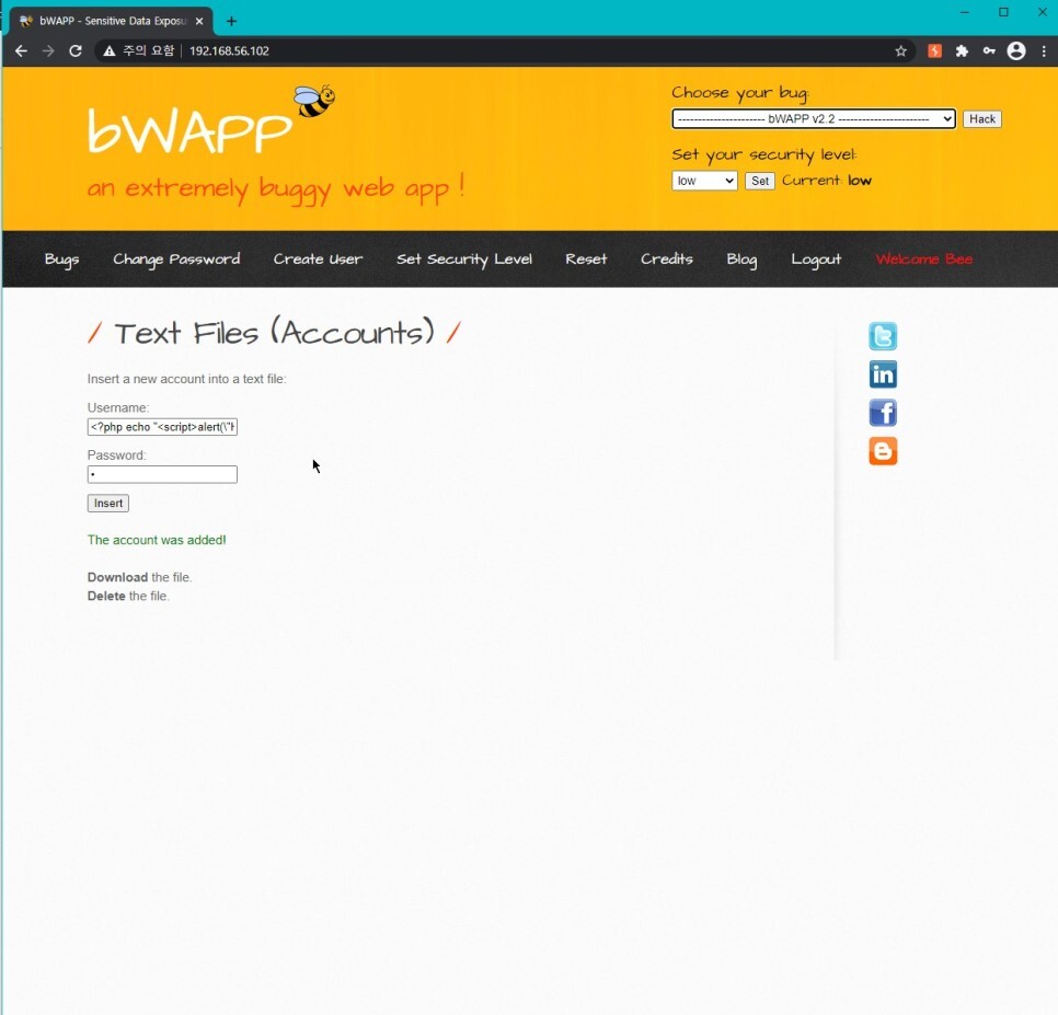 이는 단순하게 메시지를 경고창으로 띄우는 형태의 스크립트 코드이지만 악성 셸 코드나 악성 URL 리다이렉션 코드 등을 입력할수 있다. Password에는 아무 값이나 넣어주고 Insert 해서 파일을 만들어주자.