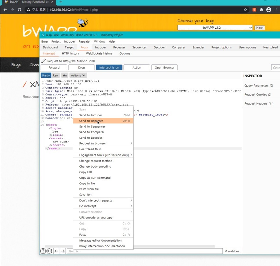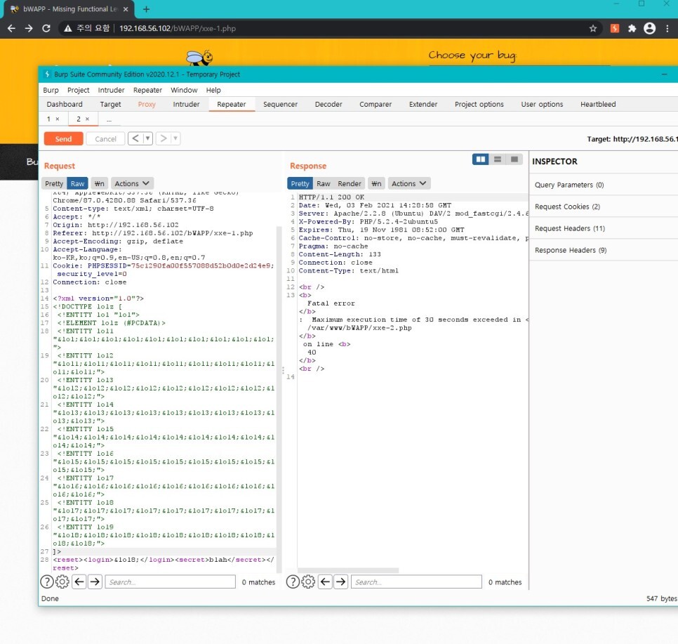 그랬더니 우측에 passwd 파일이 노출된 것을 볼 수 있다. 우클릭 후 show response in browser 메뉴를 통해 브라우저에서도 볼 수 있다. 이번에는 이를 이용해 DOS 공격도 시도해보자. XML로 하는 DOS 공격은 XDOS라고도 한다.