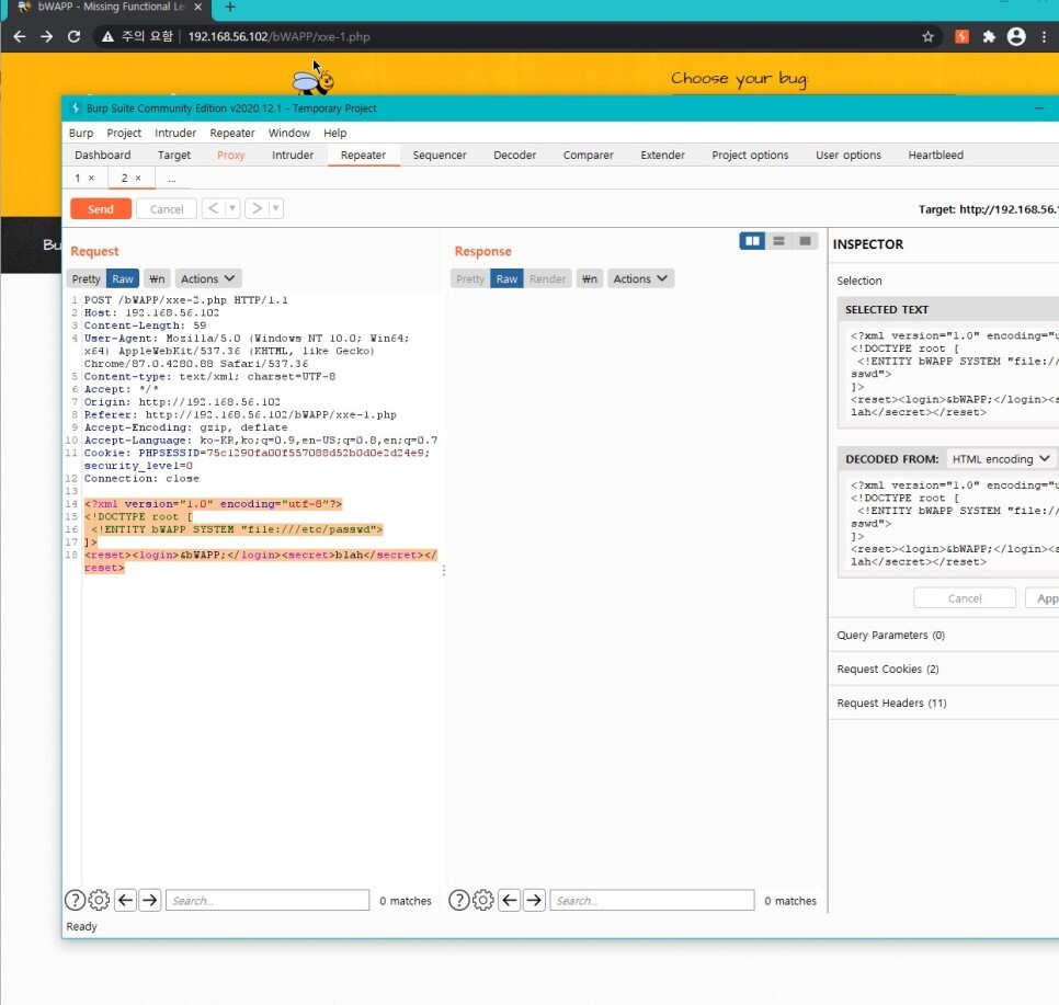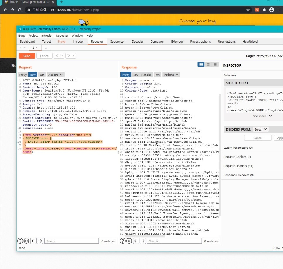 이번에도 Raw로 변경 후 외부 엔티티 참조 코드를 넣어주었다. bWAPP이라는 외부 엔티티를 선언하고 서버의 passwd 파일을 출력한다. 엔티티 선언 후에는 선언한 엔티티 참조를 위해 &bWAPP; 을 변수에 입력하여 넣어주었다.