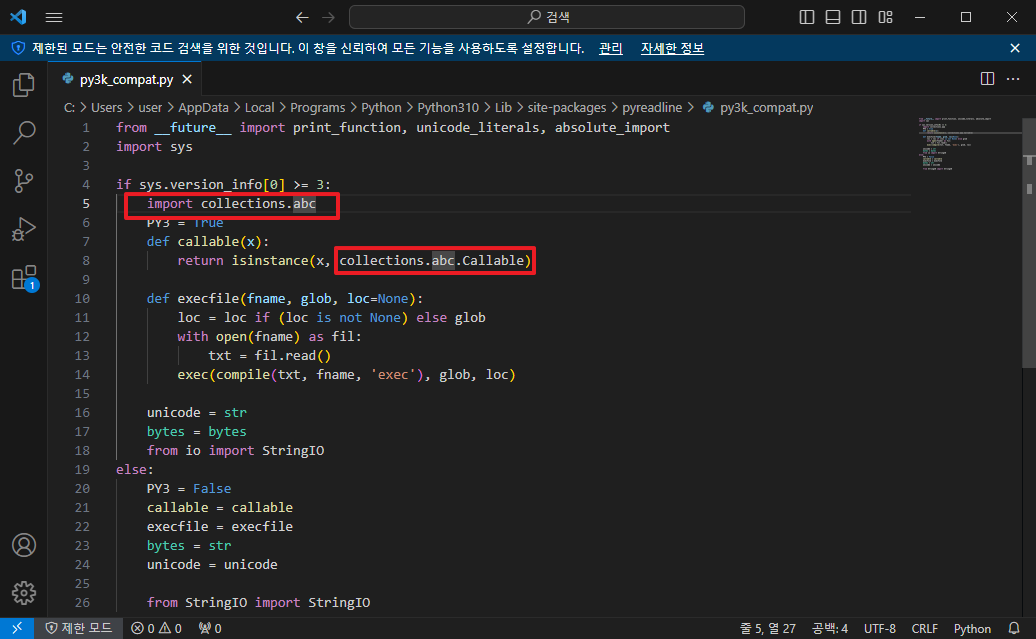 3.9로 다운그레이드 하는 방법도 있지만 귀찮으니 코드를 수정했다. 디버깅 따라가서 보니 C:\Users\user\AppData\Local\Programs\Python\Python310\lib\site-packages\pyreadline\py3k_compat.py 에 문제가 있는것을 발견.