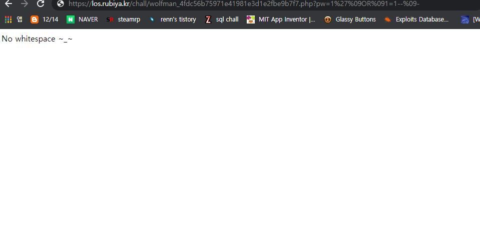 우선 평소처럼 ' OR 1=1--+- 구문을 넣어주었습니다. 그러니 No white space라는 오류메시지가 나오네요
