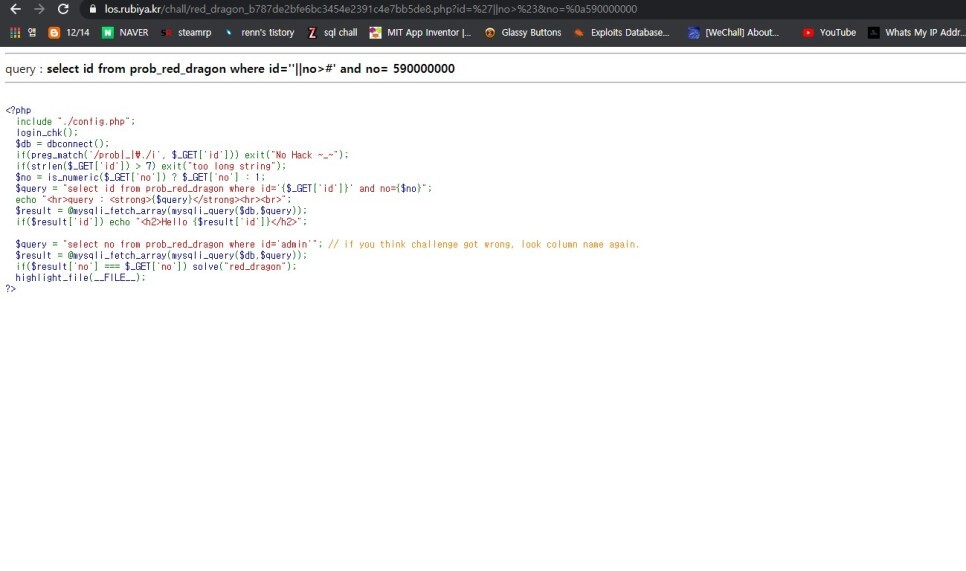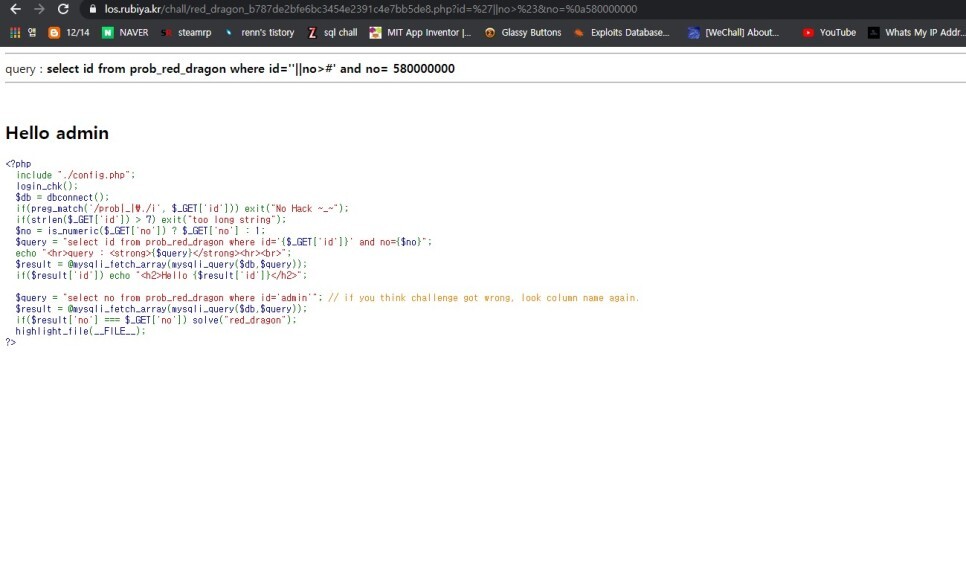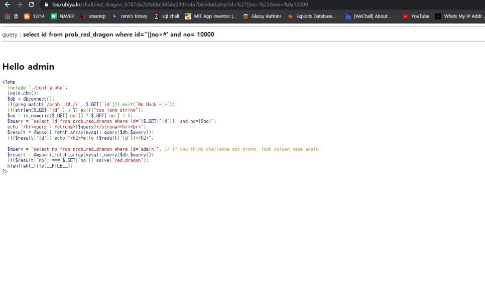 우선 id 값에 admin%23 을 넣어주면 뒤의 구문이 주석화 되어 hello admin이 뜬다.