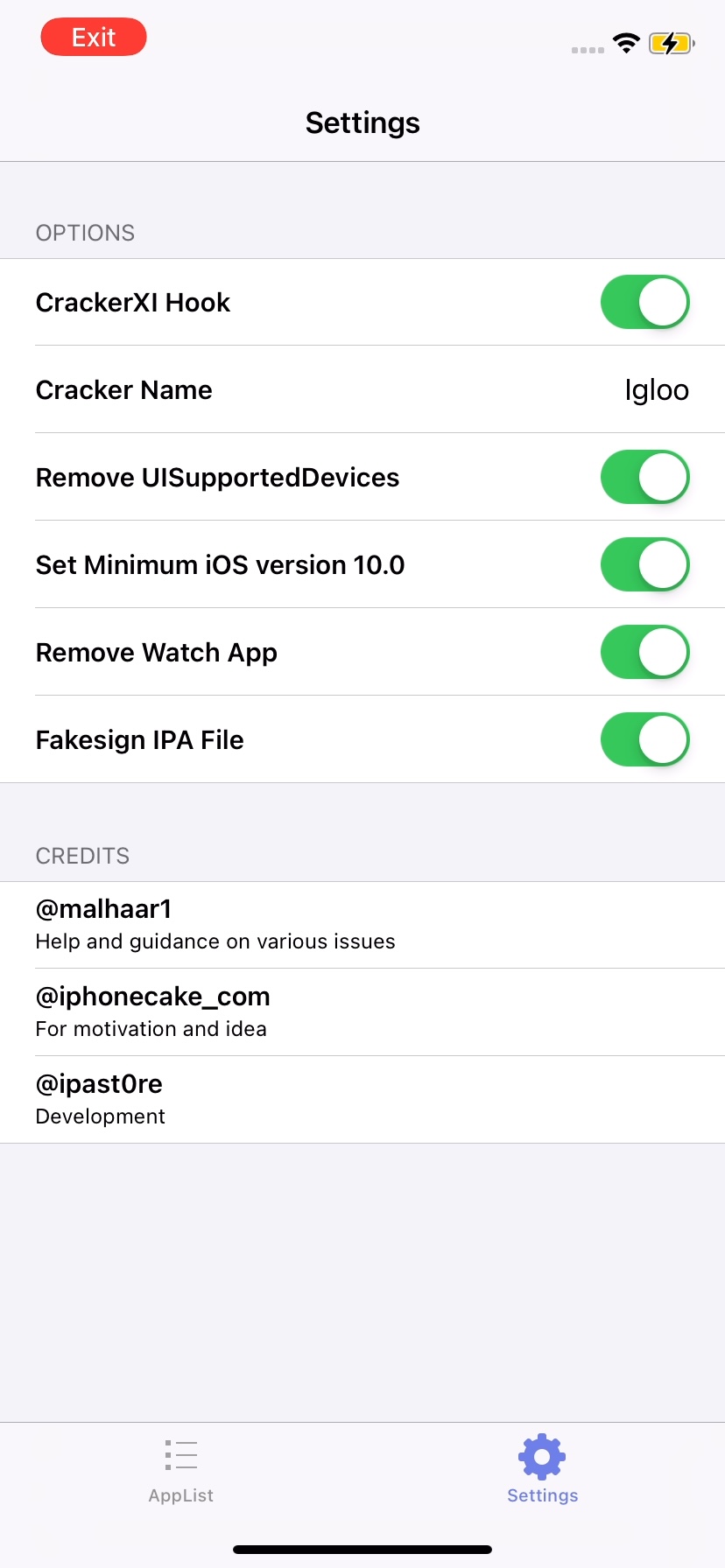 탈옥을 진행하고 나면 CrackerXI+라는 앱을 설치할 수 있게 된다. 해당 앱에 접근 후 설정에서 아래의 설정 값을 적용한다.