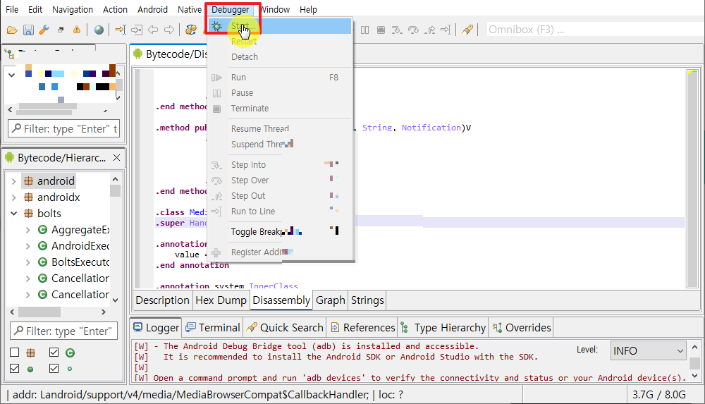 그 후 JEB 상단 벌레모양 디버거를 실행, 프로세스에 진단할 패키지 명 검색 후 더블 클릭한다.