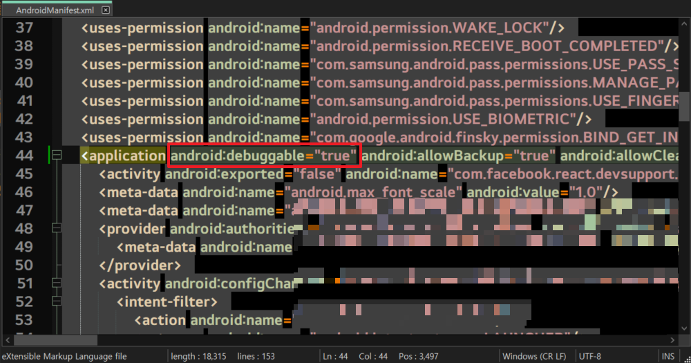 - AndroidManifest.xml(서비스, 구성요소, 액세스 권한 등 정보 포함)에서 <application android:debuggable="true"> 설정 활성화