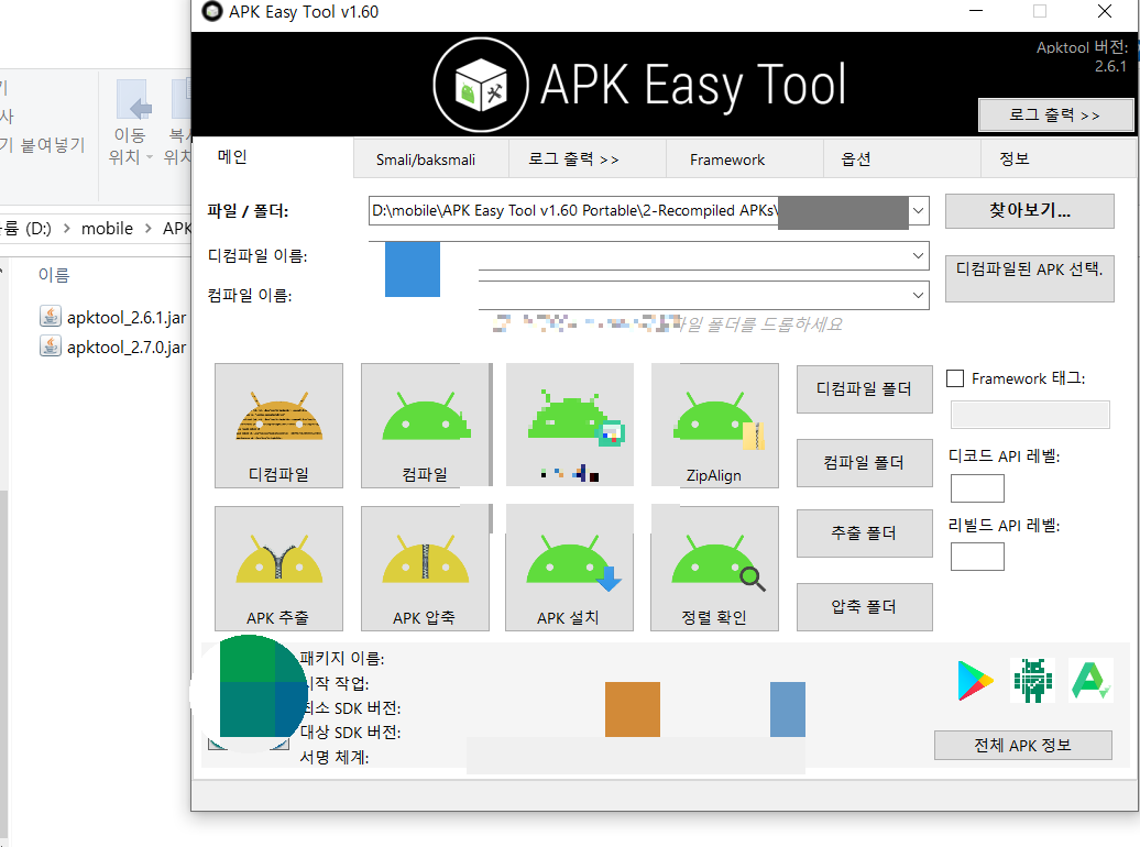 하지만 신속성을 위해 왠만하면 apk easytool을 사용하는 것이 좋다. 해당 툴은 GUI 형태로 개발되어 apktool jar 파일만 별도 경로에 삽입하고 설정하면 클릭만으로 앱 컴파일, 디컴파일, 서명 등의 작업을 손쉽게 해준다.