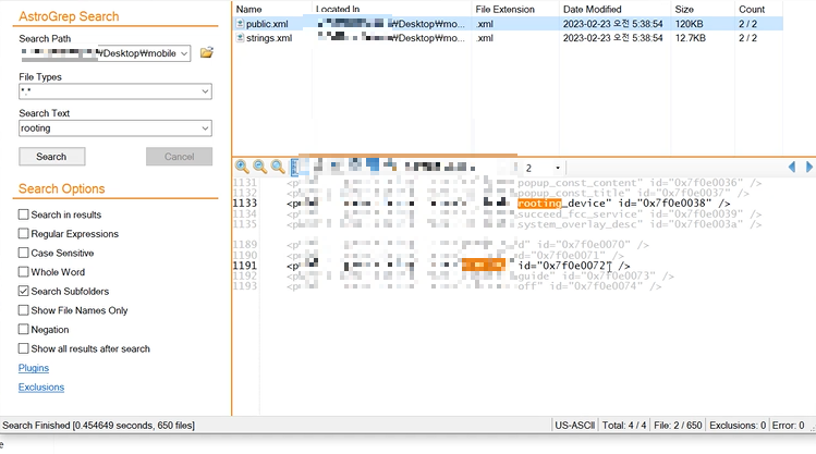 기본적인 우회 순서는 아래와 같다. 보통 루팅 탐지가 되면 루팅 탐지 관련 메시지가 출력되는 경우가 많은데 이 메시지를 Astrogrep 툴을 사용해 디컴파일한 폴더의 res 폴더에서 검색해본다.