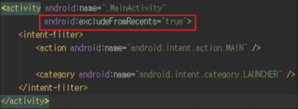 * 실행 중인 앱의 스냅샷 파일이 노출되지 않도록 “android:excludeFromRecents=”true“ 속성 설정